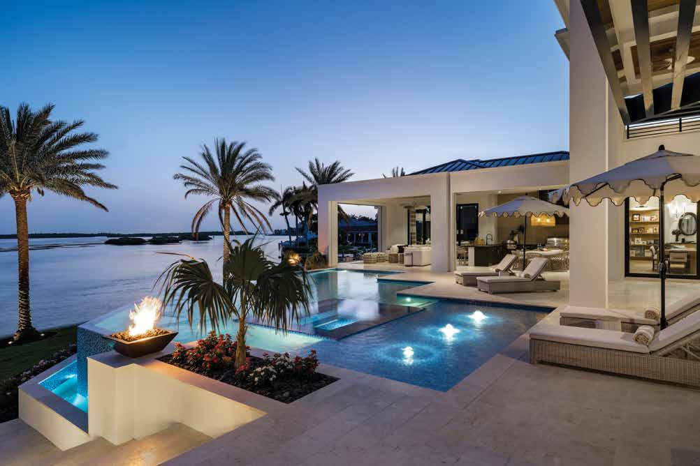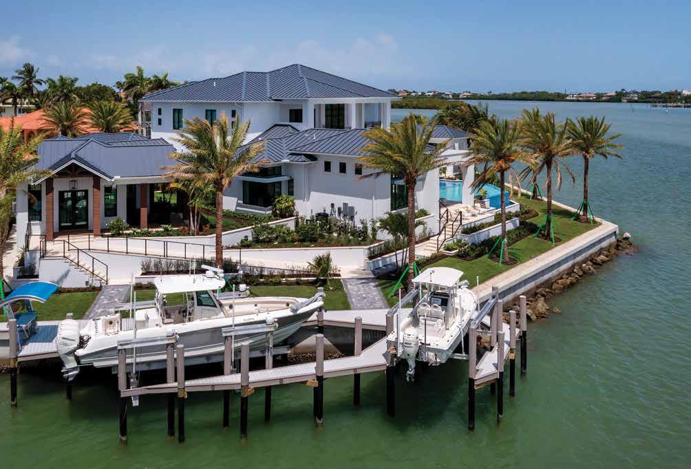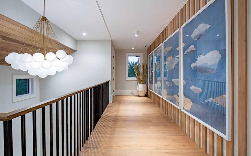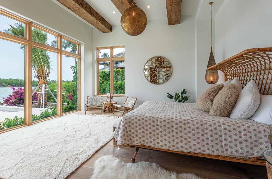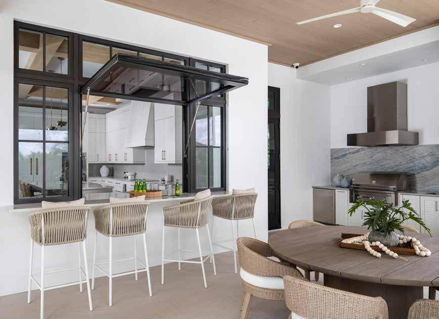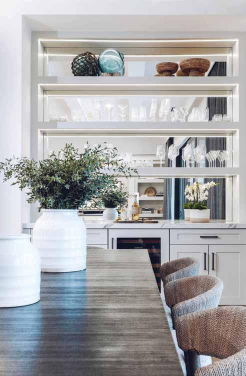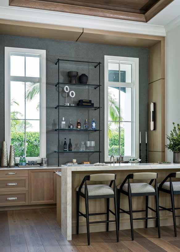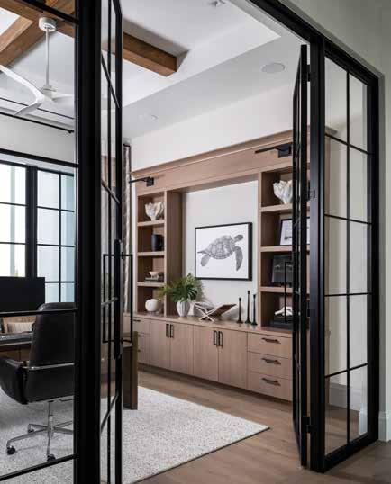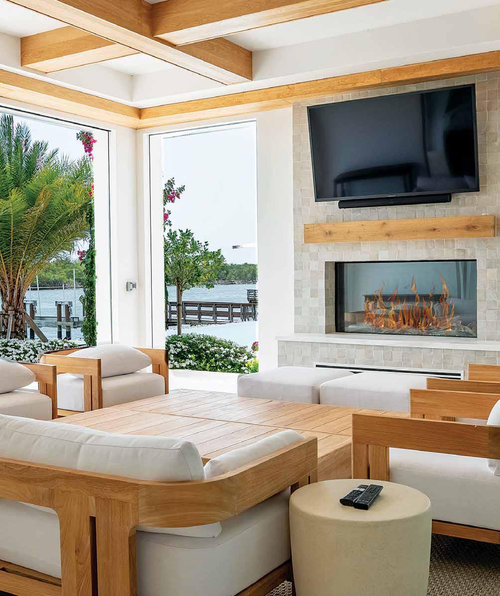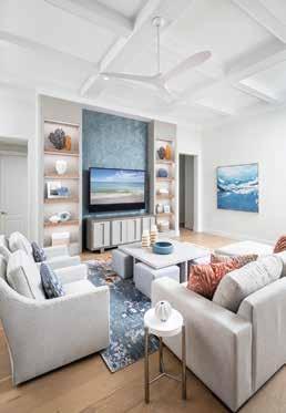 This property has exceptional water access and views, so the outdoor elements are equally important. McHenry curates destinations — from turf areas for play to tranquil fire bowls around the vanishing edge pool for ambiance into the evening. For the avid fisherman, Abad hooks every need on the first pass to design a fishing pavilion with ample storage, an ice maker, and a private bath — all linked to the dock by a gently sloped ramp that underscores the home’s practical luxury. With every challenge met, the house is both a fisherman’s dream and a family’s coastal paradise. n