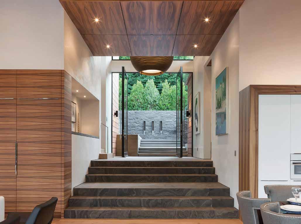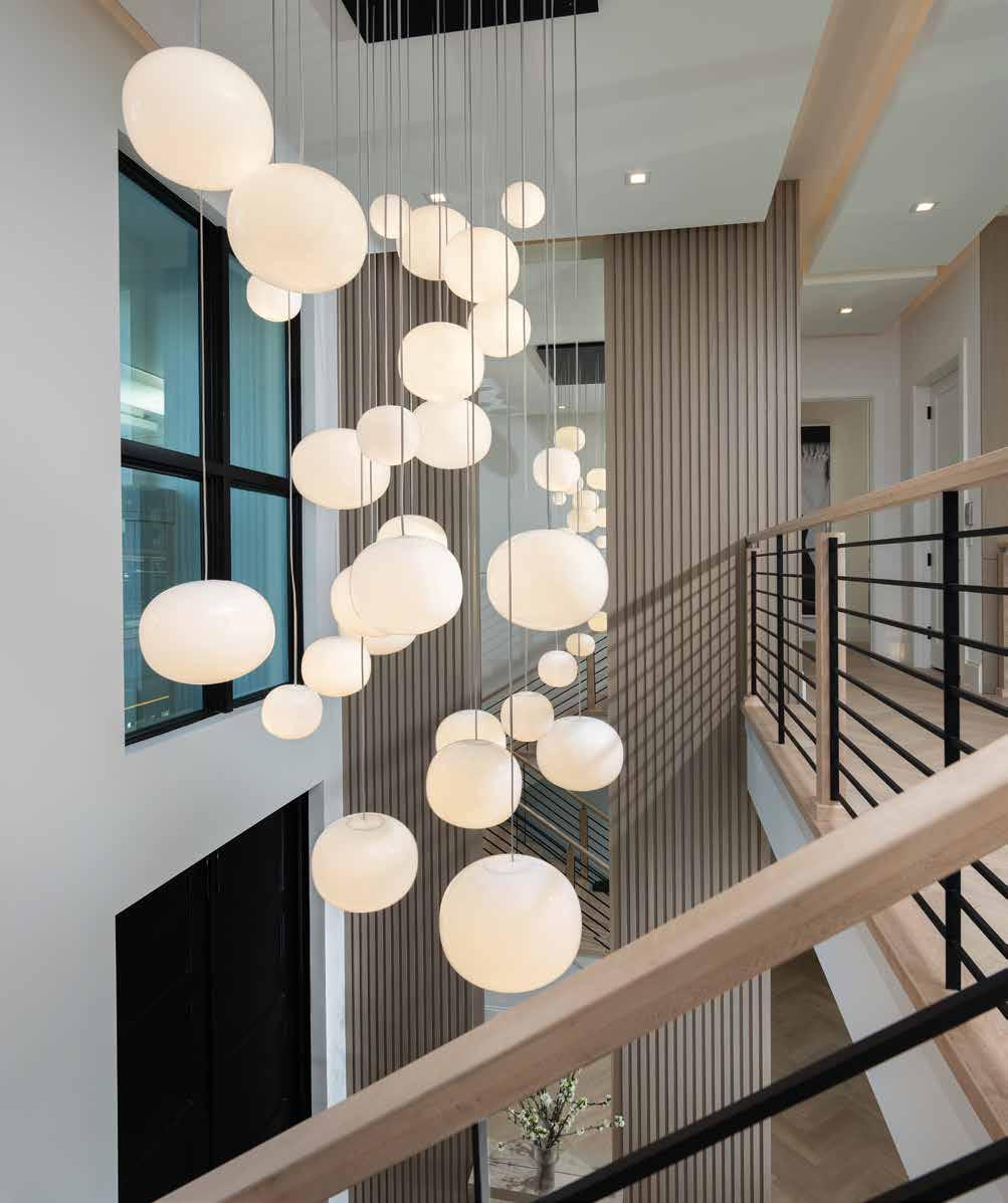Entry & Stair Tower: One wouldn’t expect a single interior step to shape the home’s exterior, but here, it eliminates the need for outdoor railings — a clever accommodation that preserves clean lines on the exterior, and a frame for a luxury entry rug from International Design Source. Natural light streams through black-framed 400 Series windows and a pivot door from Andersen Windows & Doors — sourced through Florida Wood Window & Door — illuminating McDonald’s mitered-nosing stair detail and bold geometric black railings, while overhead, a unique chandelier evokes sea birds in graceful flight.