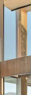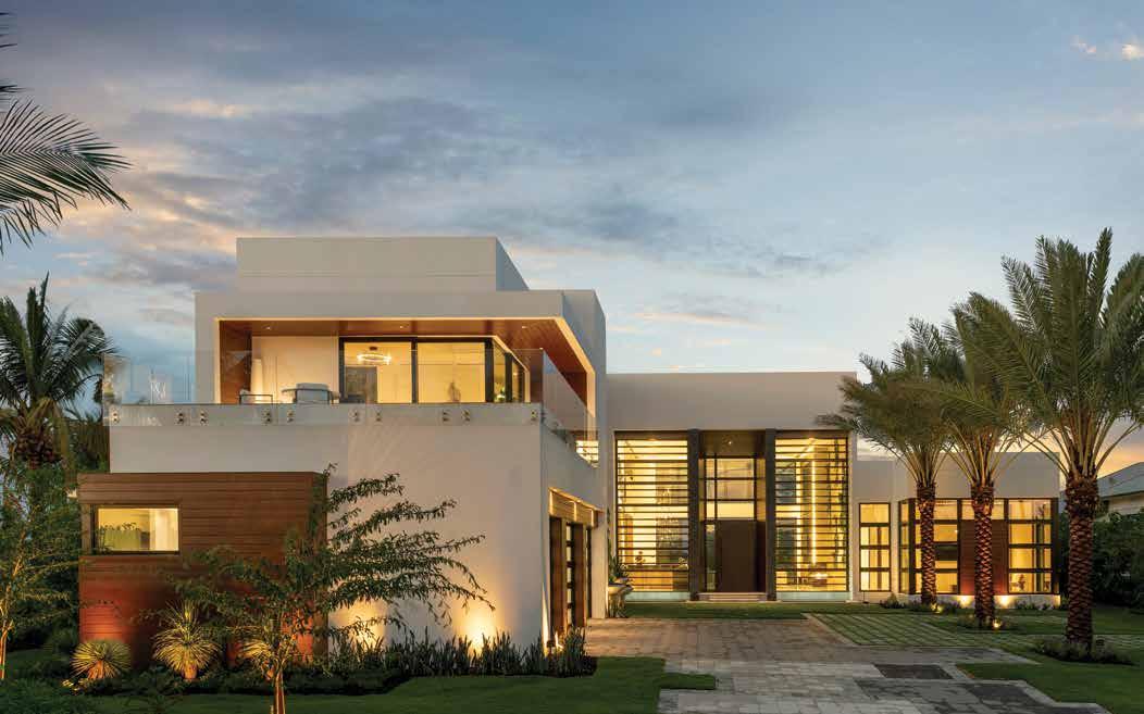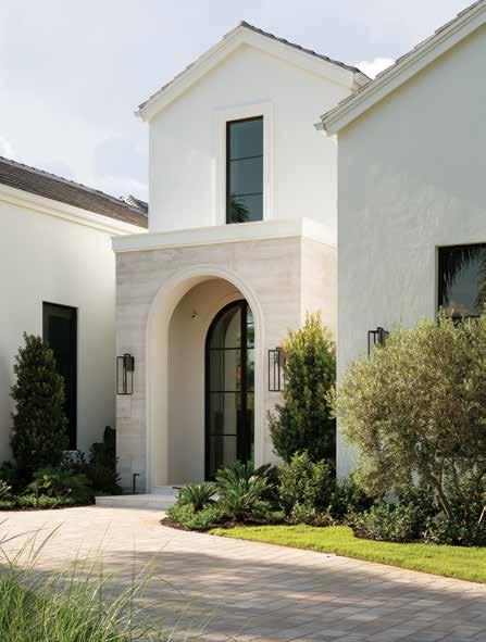 Front Elevation (Previous Spread): “I like to use diverse materials and elevations to guide the eye across the architecture,” shares Alberto Abad, Design Principal of New Architectura, who crafts a dynamic exterior that Minka McDonald, President of Jinx McDonald Interior Designs, dresses in warm white with a contrasting metal roof. For this coastal modern home, strong horizontal lines, cantilevered eyebrows over the windows, and textural ledgestone converge to create a layered dimension. Senior Project Manager Philip McHenry of Architectural Land Design appreciates how the footprint reserves land for a garden courtyard, making the landscape a discoverable experience.