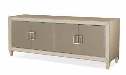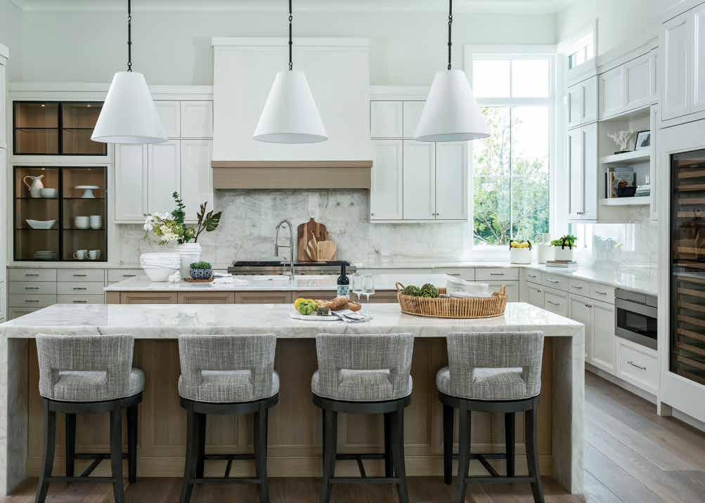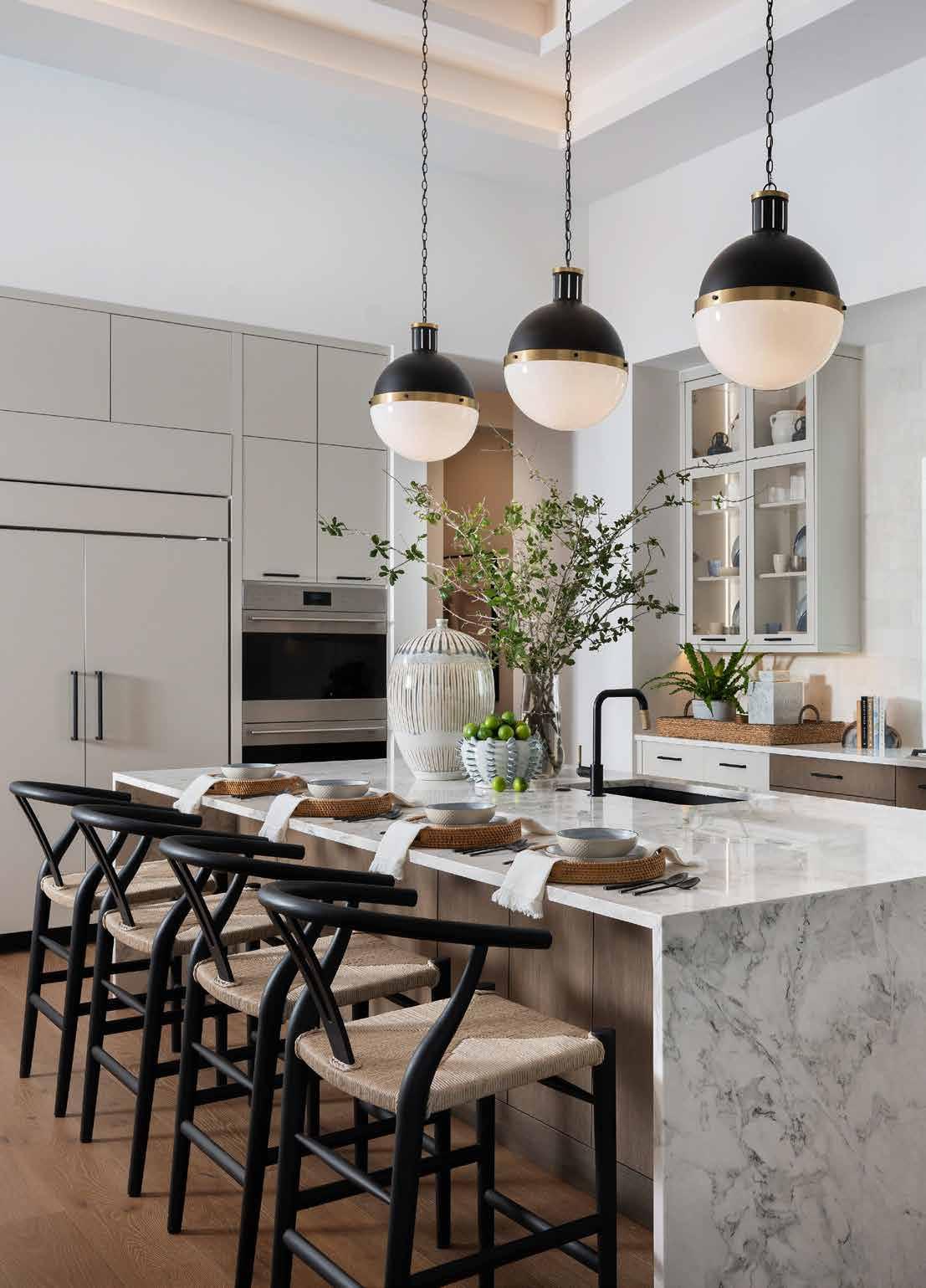 The soft sandstone and white palette of the cabinetry — crafted by High Tide Cabinetry & Design — becomes dynamic when contrasted with the black glass-front cabinets set atop the Mystery White marble countertop, all complemented by premium appliances sourced through Fuse Specialty Appliances. Gnarled dual-toned Emtek pulls in matte black, along with three Regina Andrew pendants, carry the drama through.