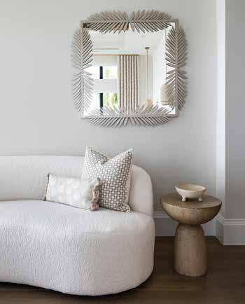 McDonald weaves in neutral botanical prints, a twig-form light fixture, and a palm-frond-style framed mirror, along with other accents that subtly affirm the home’s Florida setting. Yet the design is more than decor — she forgoes traditional window casings and trim so openings read clean and modern, while mitered-nose stairs offer a precise, tailored detail. Both are deliberate choices in achieving a sophisticated look well-suited to Marco Island.