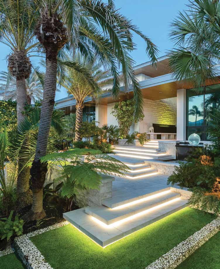 Lykos credits Alberto Abad, Design Principal of New Architectura, for his additional in-depth research into updated FEMA requirements and a structure “absolutely perfect” for the lot. For Abad, the greatest reward comes from exceeding the homeowners’ expectations. “The clients love the house — that’s the award I like to win,” Abad shares. In concert with the architecture, Senior Project Manager Philip McHenry of Architectural Land Design tends to the land. “We wanted an impactful sense of arrival,” shares McHenry. “The house is prominent with a powerful tower element, and we wanted to capture that as you approach the home.”