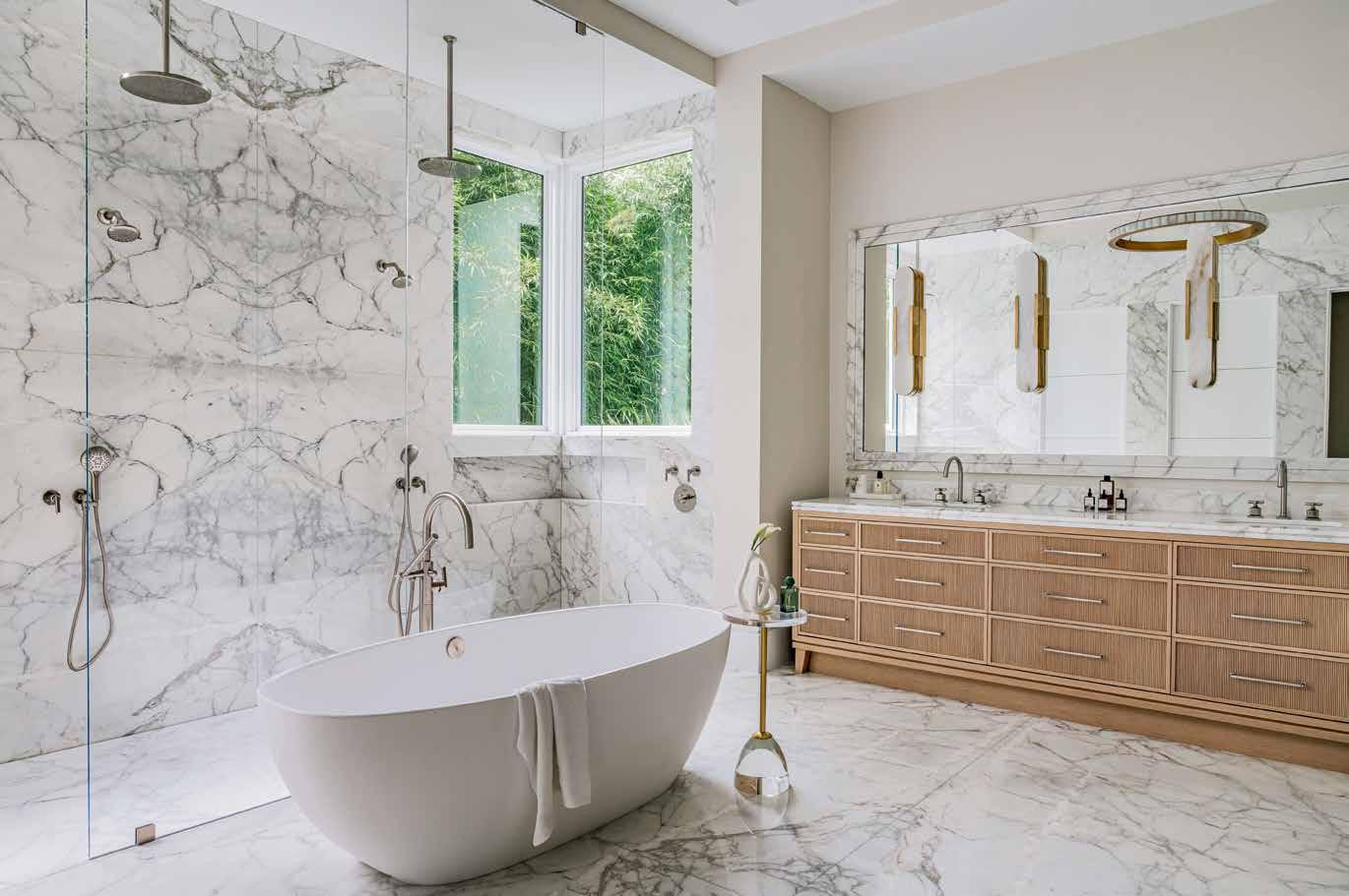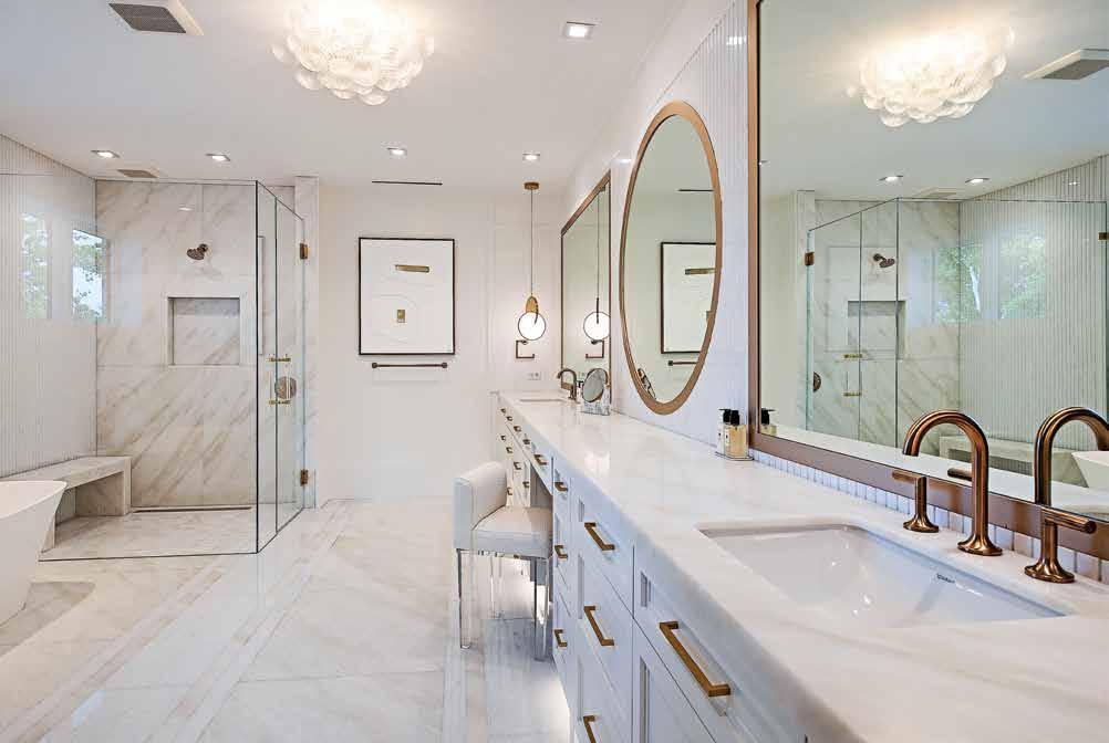 Primary Bathroom: Crisp white cabinetry paired with a luminous Cristallo countertop creates a fresh atmosphere, while gold fixtures accent the shower against large-format porcelain tiles featuring caramel and gray veining, crafting an earthy yet airy retreat. Tall storage towers in a sandstone finish surround the soaking tub, lending the space visual weight and presence. Overhead, a delicate Wilson Lighting fixture adorned with shimmering silver leaves brings a subtle touch of nature, crowning the bath with a sense of tranquility.
