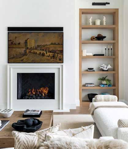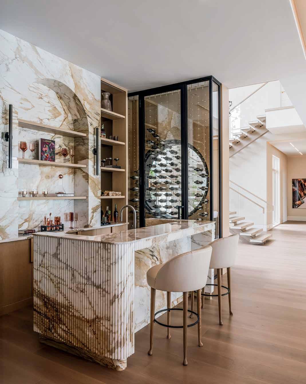 Living Room: Up close, the fireplace surround reveals a plastered texture, imparting a restful calm — a finish McDonald echoes in the sculpted kitchen hood. Beneath it all, flooring installed by Sena’s Flooring grounds the space with understated elegance. Within the fireplace, black herringbone brick adds depth and weight, while soft fern-patterned pillows from Schumacher bring a hint of nature to the Vanguard sectional. Four tailored-form swivel chairs from Hickory Chair create a conversational area with a direct sightline to the wine bar and its enclosure — a space McDonald defines as crisp in design and outfitted with every necessity within reach.