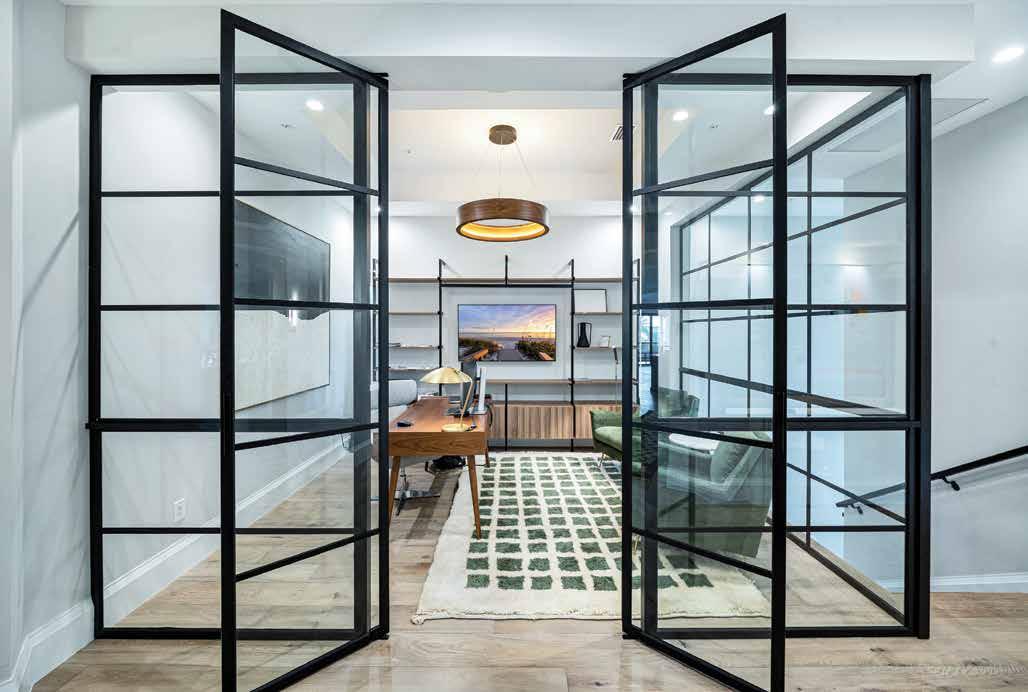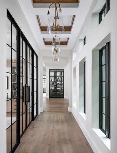Hallway & Study: From this vantage point, the wine enclosure comes into view, its sunlit frame mirroring the black panes of the study doors and windows. McDonald lines the trays in the ceiling with sleek wood in place of traditional crown moulding, reinforcing the clean contemporary aesthetic. Finished in a rich nutmeg hue, the wood imparts warmth that echoes the saddle leather pendants from Ralph Lauren, uniting the space in a harmonious and inviting material palette.