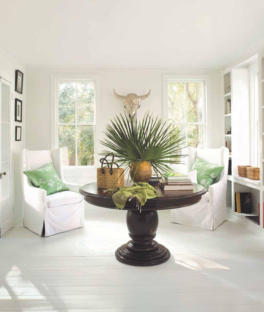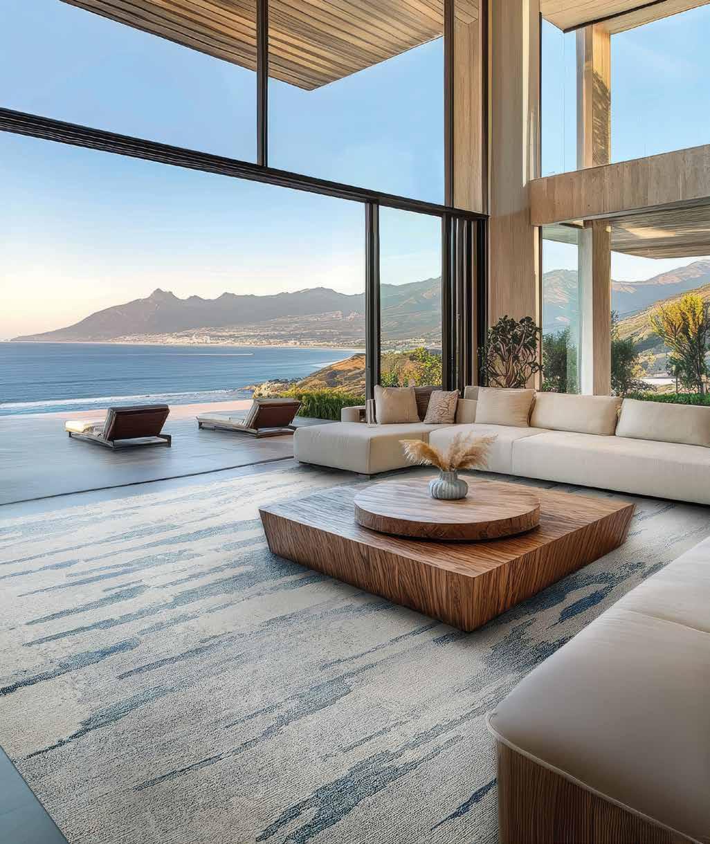 To the left of the entry, a lush courtyard sits beneath the stair tower, its open layout drawing natural light deep into the heart of the home where McDonald centers the interior. Rustic pieces anchor the rooms, tailored furnishings add refinement, and the interiors exude a bright, airy sensibility drawn from the shoreline’s driftwood and sandy hues. The view out the living room windows frames the water — an intention set forth by Abad. u