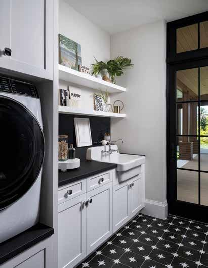 Laundry & Mud Room: Just steps from the fishing pavilion, this laundry and mud room masterfully combines everyday functionality with high-impact interior design. McDonald anchors the space with striking black-and-white starburst tile from Design Works, extending the bold, high-contrast theme to the cabinetry. A classic farmhouse sink paired with a vintage faucet from Naples Plumbing Studio adds timeless charm, while a practical ledge above echoes the details of the custom cabinetry and countertop, perfectly blending style and utility.