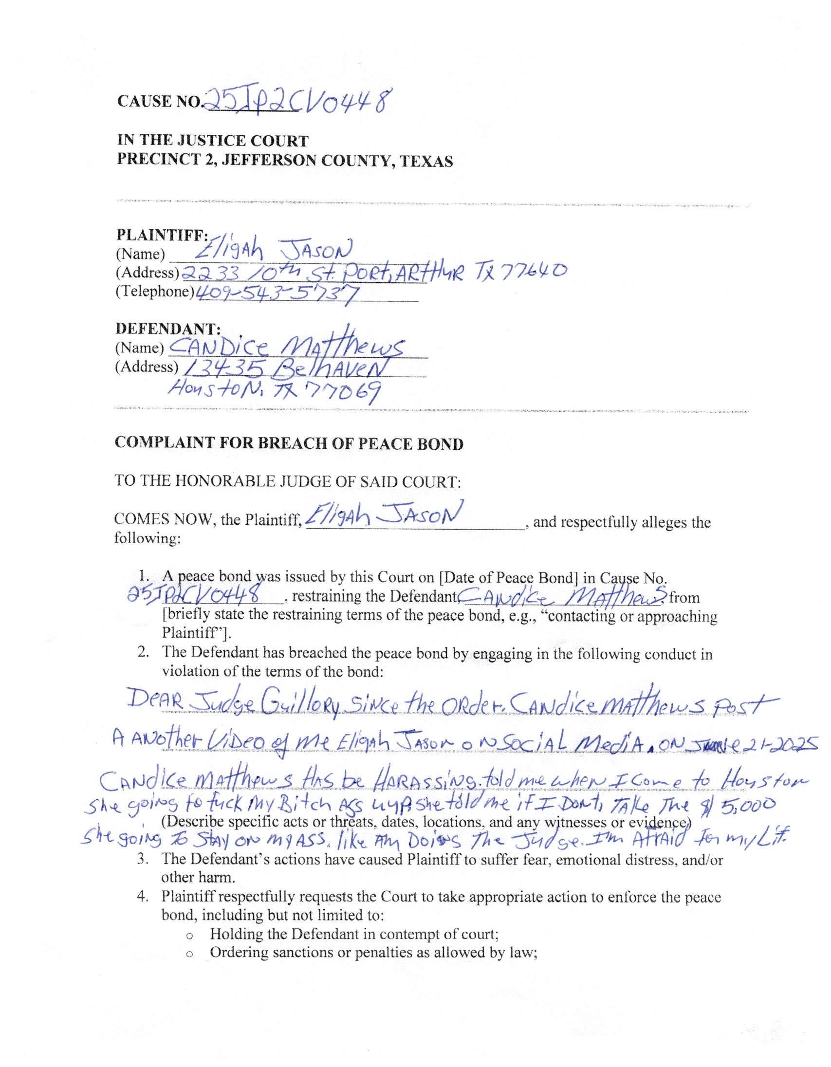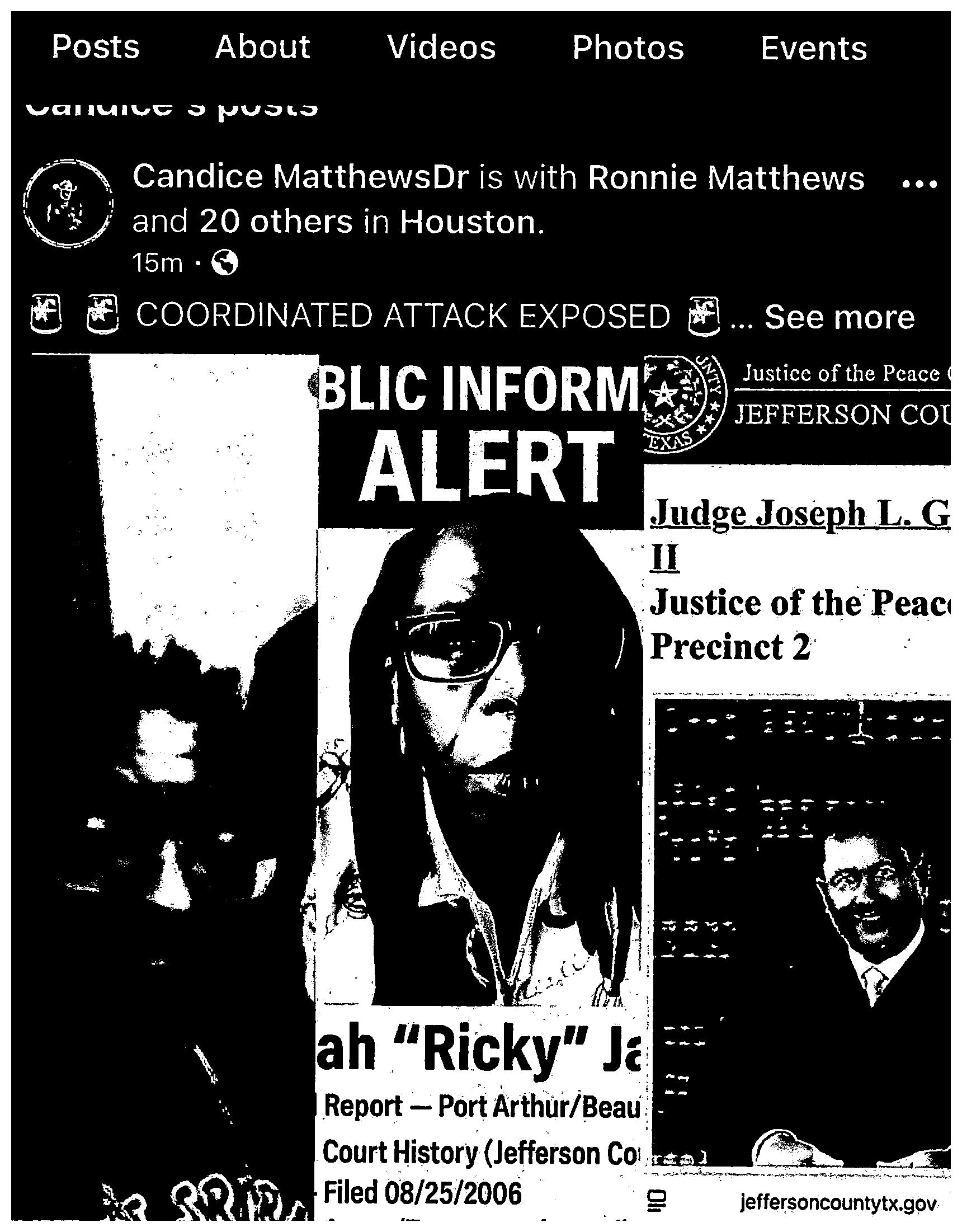 At 10:00 A.M., on Monday, July 7, 2025, the cowboy-hat-wearing woman called "Dr." Candice Mattews has to appear in a Jefferson County, Texas courtroom for a "Peace Bond Hearing," after she allegedly threatened to do bodily harm to Ricky Jason if he comes to Houston, Texas. Aubrey R. Taylor Communications publishes the Houston Business Connections Newspaper. All Rights Reserved.