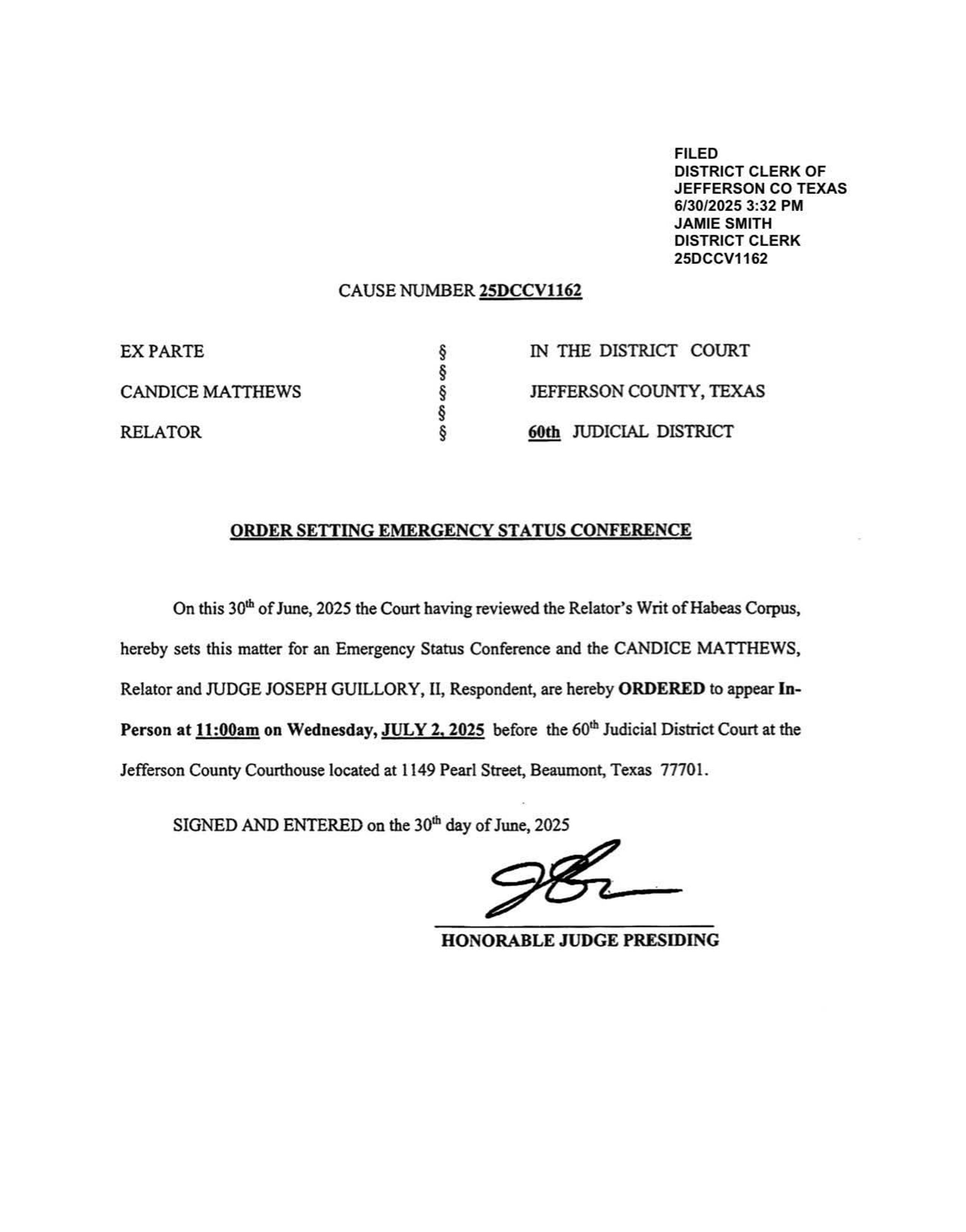 Candice Matthews and Judge Joseph Guilory, II, have both been ordered to come to the 60th Judicial Court on at 11:00 AM, on Wednesday, July 2, 2025, for an emergency status conference related to the Writ of Habeas Corpus "Dr." Candice's lawyer, Adjua Umoja-Justice filed on June 30, 2025. Aubrey R. Taylor Communications publishes the Houston Business Connections Newspaper. All Rights Reserved.