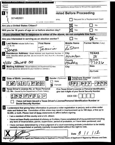 An inquiry of our voter registration database has found the following record(s) for TAMORIA RASHON JONES in Harris County, Texas: