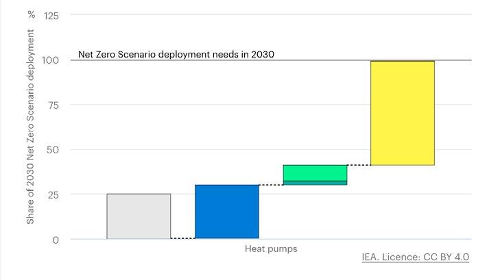To get on track with IEA’s Net Zero Emissions by 2050 (NZE) Scenario, the global heat pump stock would need to almost triple by 2030, which means that manufacturing capacity will need to quadruple by 2030 to reach the NZE Scenario targets.