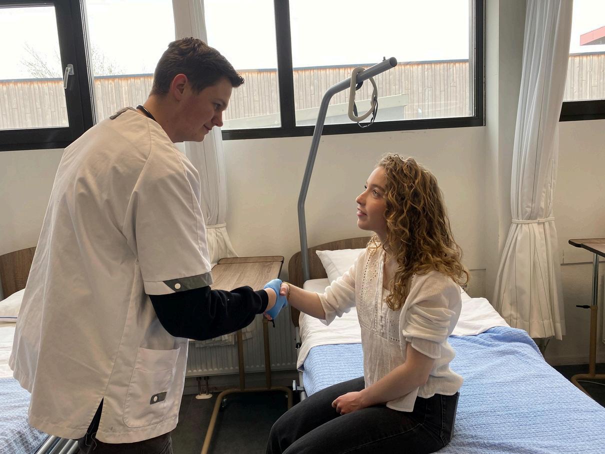 hIJ VERZORGT DE WOND EN DOET VERBAND OM.