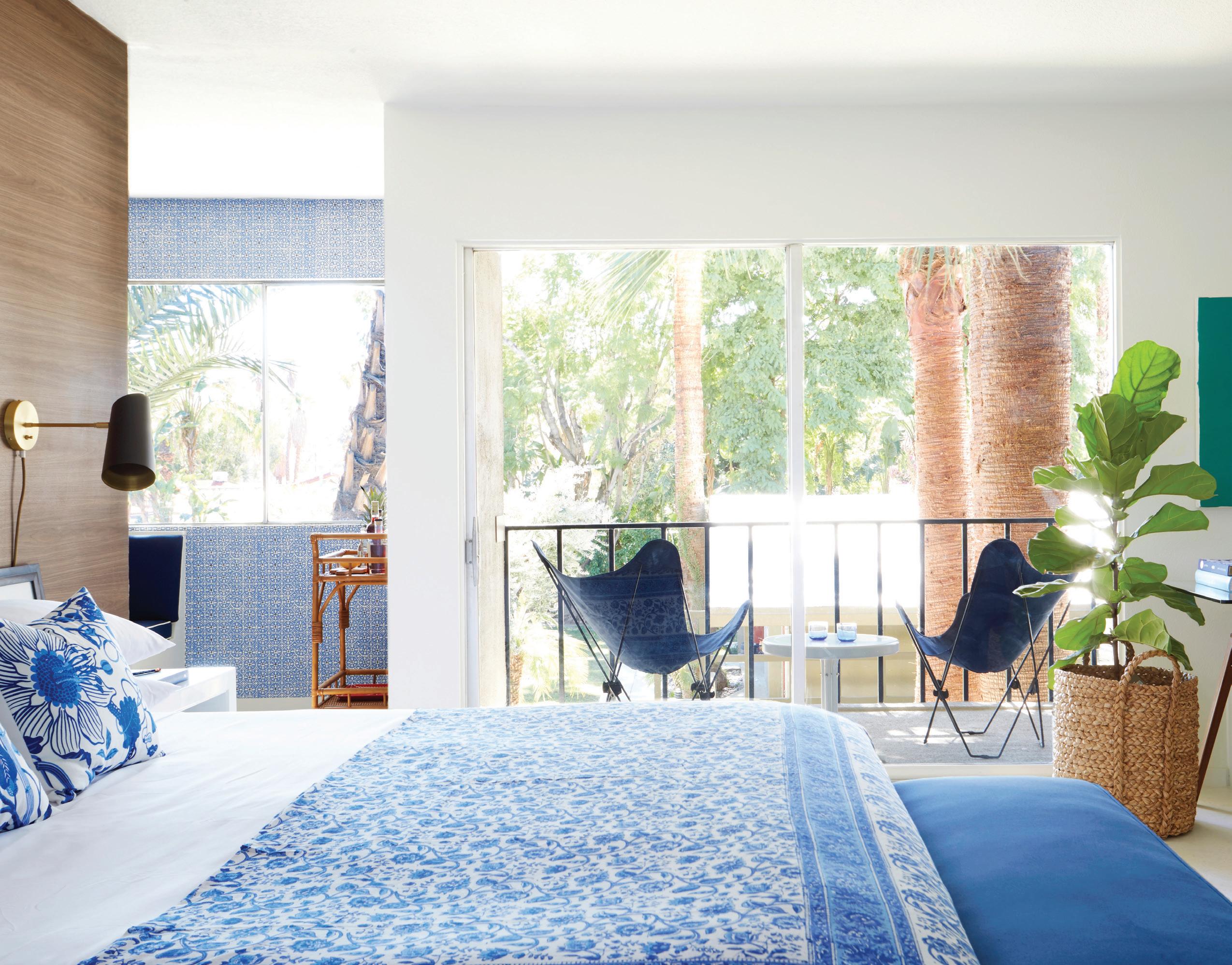 After the Whaleys, the property had a long run as the Chase Hotel. Several years ago, the team behind the Sparrows Lodge, also in Palm Springs, acquired the property and launched a major renovation, keeping the original design largely intact. Sikes was called in for a significant refresh, putting into play a vibrant blue and white color palette in the lobby (formerly the owners’ apartment), bar, lounge and rooms. Gio Ponti-inspired tile in the bar and artwork by the likes of David Hockney, Annie Leibovitz, Roy Lichtenstein, Geroges Braque, John Baldessari and Donald Sultan set the tone for the inn, with rooms featuring Waterworks bath fixtures, modern lighting, playful fabrics and walnut and wicker accents. French artist Lucas Beaufort updated the shuffleboard court with his creative spin, and chef Jon Butler now presides over the informal indoor/outdoor restaurant, The Pantry.