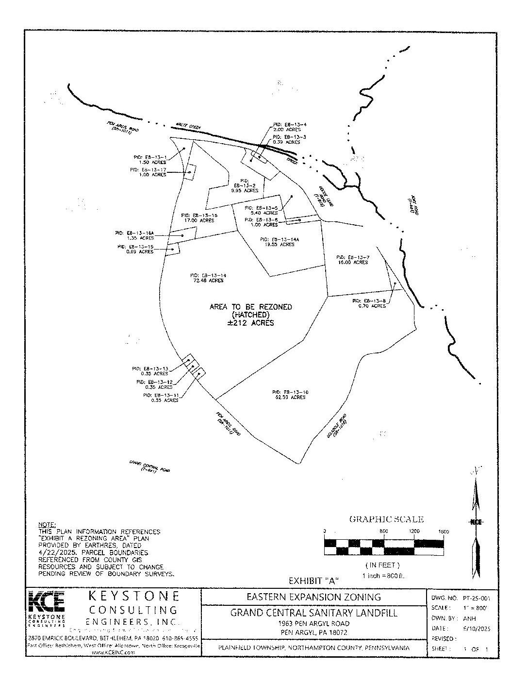 AN ORDINANCE OF THE PLAINFIELD TOWNSHIP BOARD OF SUPERVISORS AMENDING THE PLAINFIELD TOWNSHIP ZONING MAP, BY CHANGING THE ZONING CLASSIFICATION OF CERTAIN LANDS SITUATE IN PLAINFIELD TOWNSHIP, NORTHAMPTON COUNTY, PENNSYLVANIA, AS SPECIFICALLY DESCRIBED BELOW, FROM FARM AND FOREST (FF) DISTRICT TO SOLID WASTE PROCESSING AND DISPOSAL DISTRICT (SW) DISTRICT, SAID AREA TO BE REZONED IS APPROXIMATELY 212 ACRES AND IS LOCATED IN AN AREA GENERALLY BOUNDED BY PEN ARGYL ROAD (S.R. 1011) TO THE WEST, BOCCE CLUB ROAD (T-666) TO THE NORTH, AN OLD RAILWAY BED TO THE EAST (PARCEL E09-19-001A), AND DELABOLE ROAD (S.R. 1016) TO THE SOUTH.