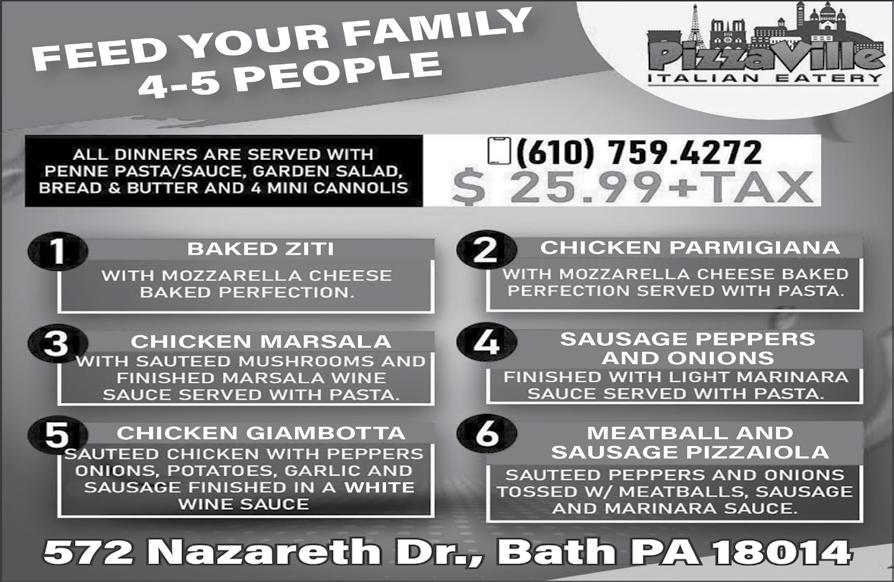 Stroh - Associate Publisher & Editor Tony Pisco - Art Director Danielle Tagliavia- Delivery Driver The Home News ISSN 1944-7272 (USPS 248-700) is published every Thursday of the year at a local subscription rate of $24.95 annually; 50-cents per copy on newsstands. Periodicals postage paid at Bath PA and additional entry offices. A General Circulation Newspaper Since 1942 POSTMASTER: Send address changes to: The Home News PO Box 293142, Kettering OH 45429 The Home News does not assume responsibility for any advertisements beyond the cost of the ad itself. We cannot be responsible for typographical errors. We reserve the right to reject any