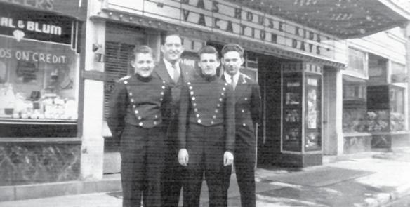 He recalled, “As usher, we were paid $8 a week. Door rate was $12 a week. A ticket was a bargain at 65 cents. We all wore uniforms, but we convinced our manager, Mr. Shuck, to change to white shirts and ties. He agreed. After a show completed its run, it was up the ladder and change the marquee.”
