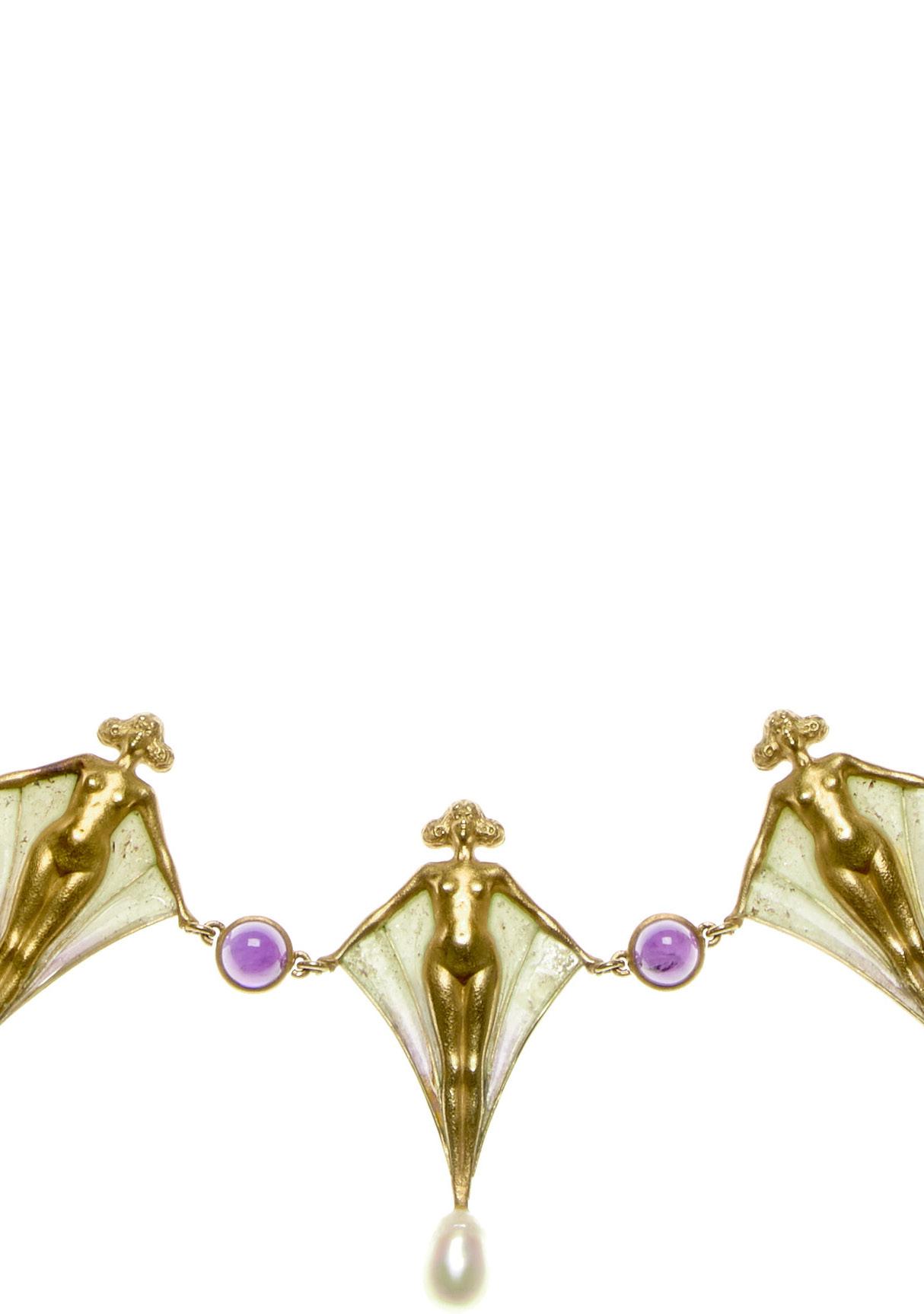 Emblema di eccezionalità e genio creativo, questo straordinario collier firmato René Lalique è una celebrazione della femminilità e dell’estetica simbolista che ha reso il suo autore maestro indiscusso dell’Art Nouveau. Un girotondo di figure eteree scolpite in oro giallo, arricchito da perle barocche, ametiste cabochon e inserti in vetro lumeggiato trasparente - autentico marchio di fabbrica dell’artista - dà vita a un’opera di pura poesia visiva, sospesa tra sogno e natura.
