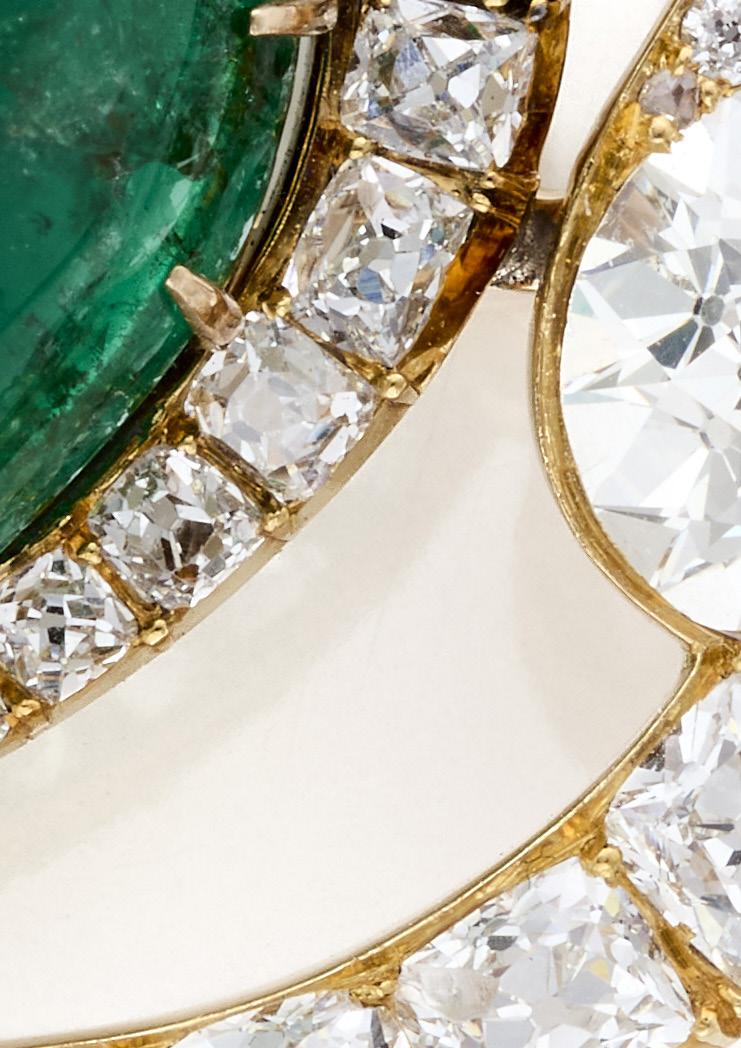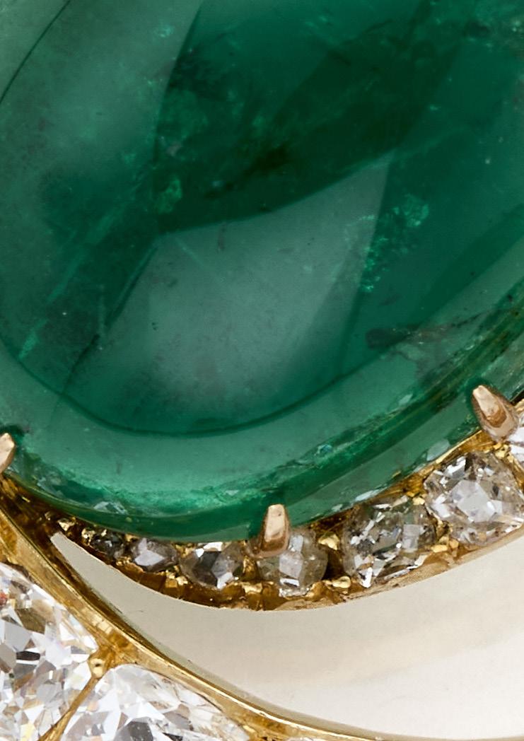 Spilla in oro giallo 585/1000 con smeraldo cabochon di ct. 17,70 circa e diamanti old mine per complessivi ct. 10,10 circa, diamante principale di ct. 3,40 circa, g 17,50 circa, lungh. cm 3,50 circa. Marchi russi di saggio e dell’orefice RS. Provenienza: Maria Alexandrovna, figlia dello Zar Alessandro II, moglie di Alfred Duca di Edimburgo. Accompagnato da analisi gemmologica SSEF n. 145784 del 10/04/2025, Basel.