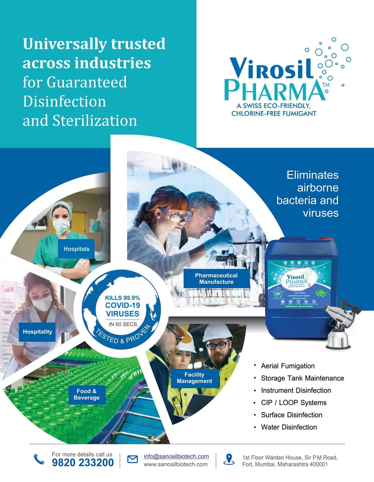 Sanosil Biotech is marketing this disinfectant under the 'Virosil Pharma' brand name and is targeting the entire industrial belt of India. The com-