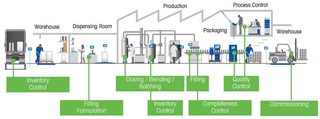 that guides operators through production processes. Initially, scales are used in material receiving to verify incoming or outgoing components and reconcile inventory. Next, scales and balances are found in dispensing areas to weigh components according to predefined formulations. Then, scales are used when checking for com-