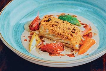 pan-seared Surinamese sea bass with saffron and crispy chorizo crust, served with cauliflower, braised leek, watercress and lemongrass sauce