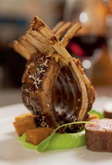 New Zealand Whole Rack of Lamb pan-seared loin of lamb, served with braised barbecue lamb rack ribs, crème of sweet peas, polenta croutons and jus