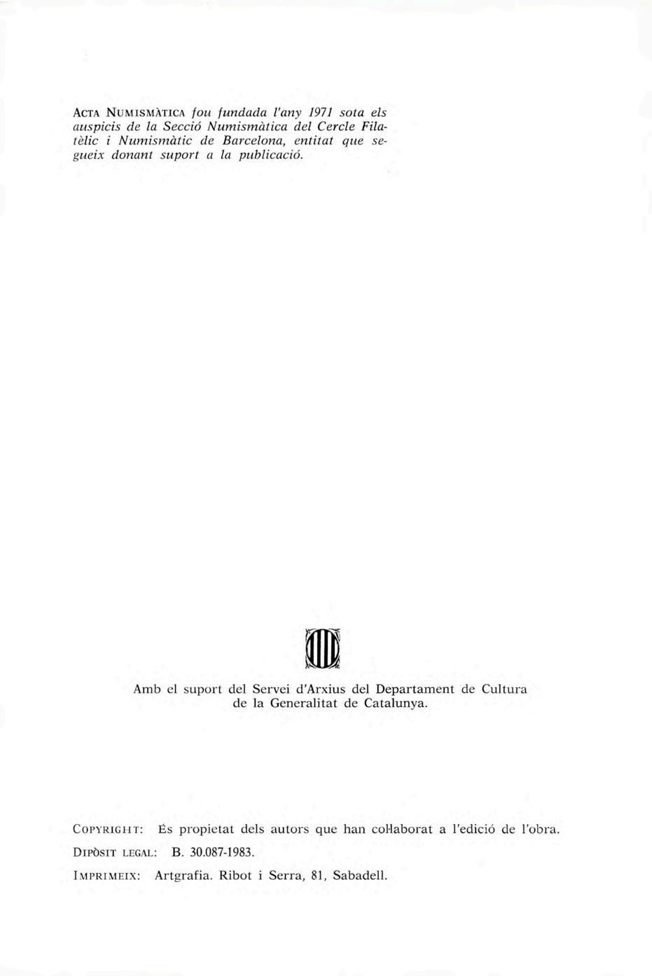 ACTA NUMISMATICA tau [undada l'any 1971 sota els auspicis de la Secci6 Numismatica del Cercle Filatelic i Numismatic de Barcelona, entitat que segueix donant suport a la publicacio.