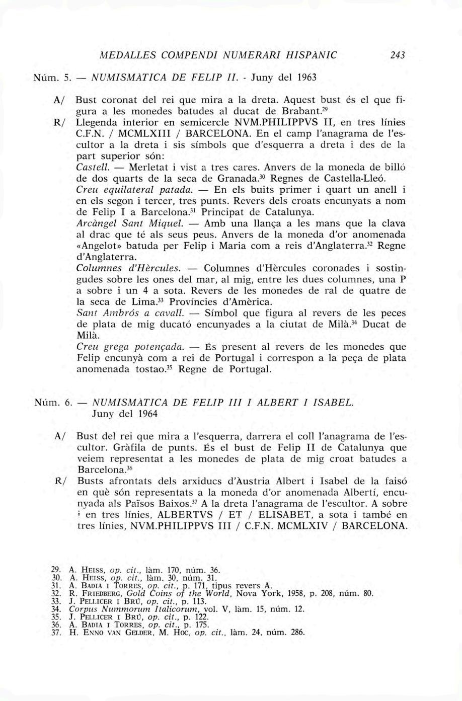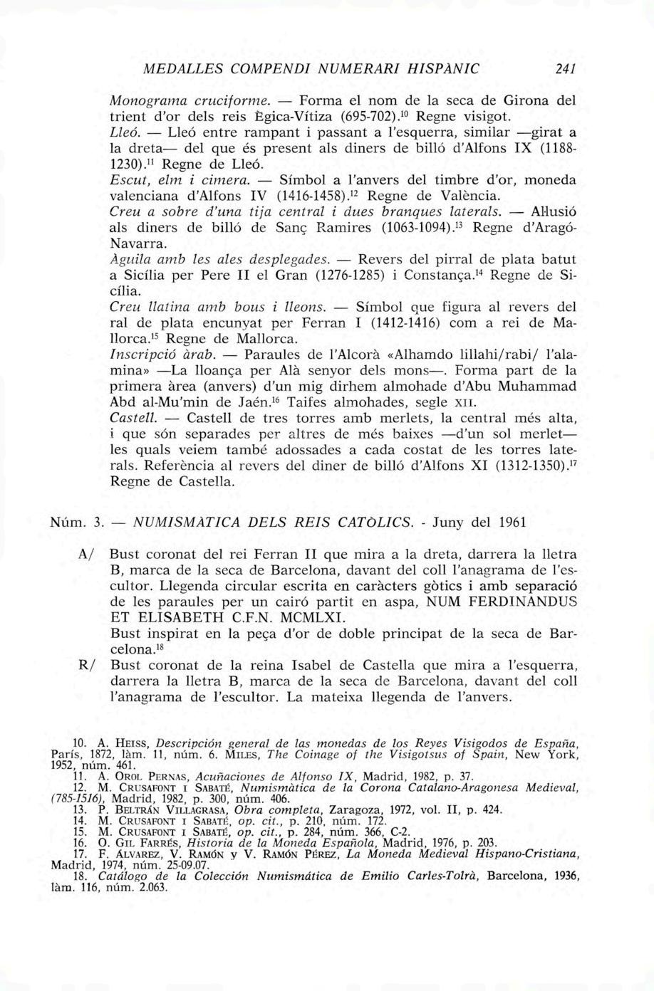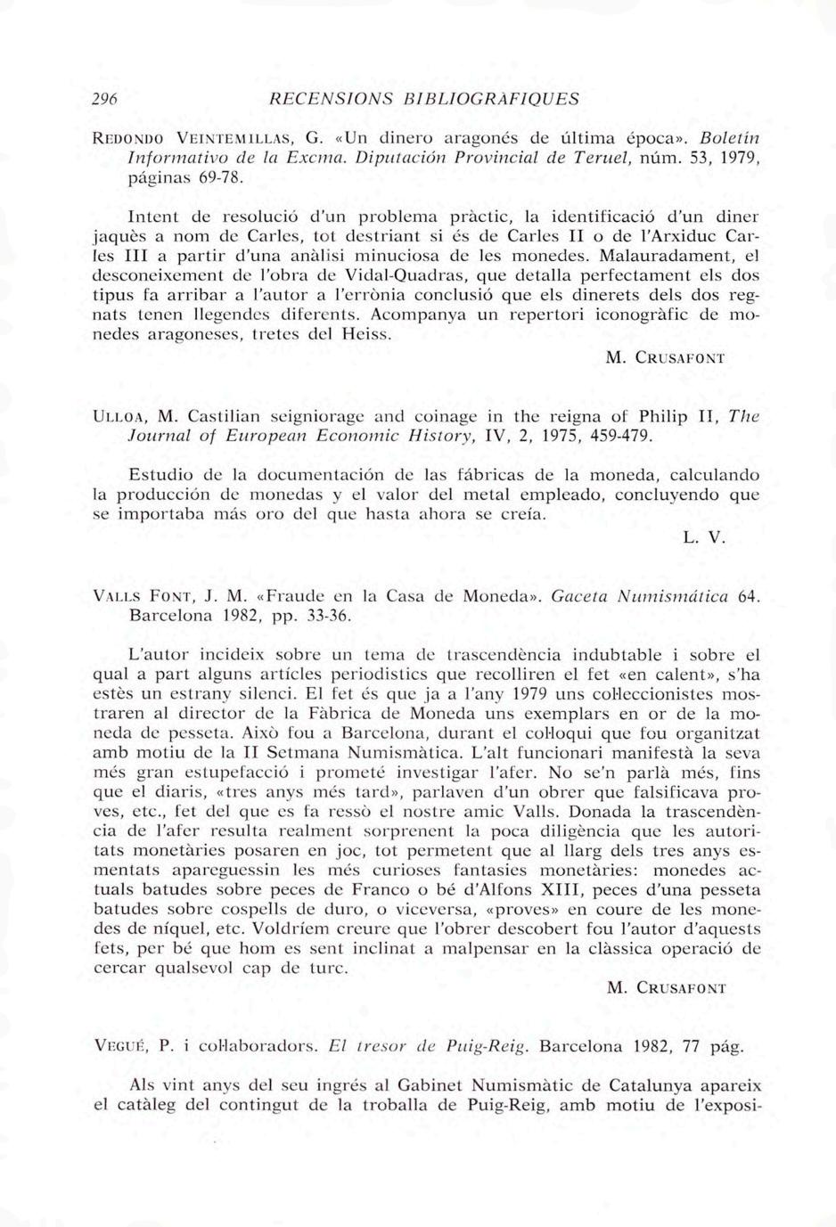 Creiem que nornes en algun cas I'autor, potser per seguir arnb massa fe el C.N.!., inclou tipus dubtosos, com ara el mig ral i el quart de ral de Ferran II, tipus 16 i17 daquest regnat, que deuen esser dobles callaresos emblanquits. Aixo ha donat peu que E. Pi ras hagi fet un refregit del cataleg d'aquest llibre, amb l'unic merit d'haver destriat aquestes monedes.