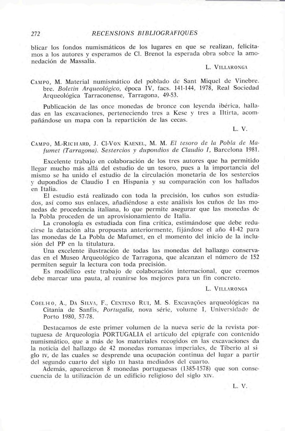 CAMPO, M. Material numismdtico del poblado de Sant Miquel de Vinebre. (L. V.) 272