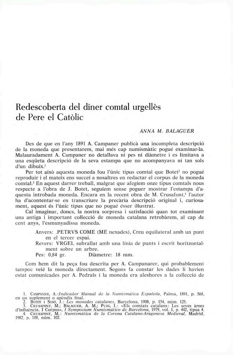 BALAGUER, A. M. Redescoberta del diner comtal urgelles de Pere el Catolic 167