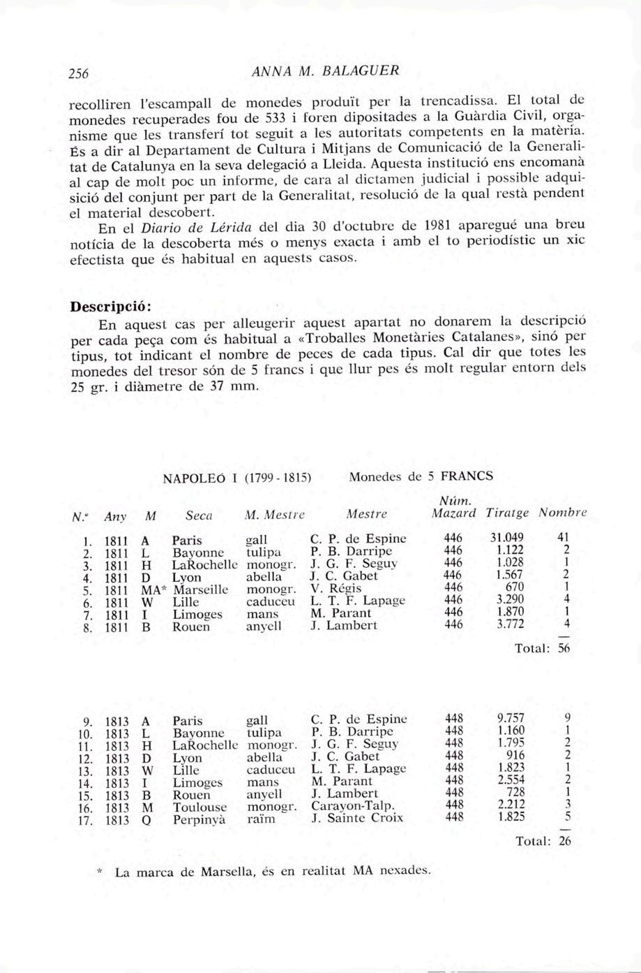 Acurat estucli metrologic cle les emissions barcelonines cl'aquest valor. Es interessant l'observacio de la perdu a cle pes en les emissions cle coure, que pot assenyalar una tendencia a I'estalvi cle rnetall per part cle la seca, a mida que avancaven els anys cle la guerra. La variacio en les peces foses no es pas, en canvi significatiu, si deixem cle considerar els anys 1808 i 1814, per la seva poca indicencia en mancar nombre suficient d'exernplars. Creiem, cle tota manera, que despres cle l'excellent estucli d'Anna M. Balaguer a Acta Numismatica X (pp. 171 iss.), tot partint de documentacio cle seca, no es possible cle sostenir, com no sigui amb I'aportacio cle nova documentacio, que les peces foses siguin genuines. En qualsevol cas, l'article cle Padro ens clemostra con l'estucli acurat cl'una serie monetaria pot anar incorporant nous i nous coneixements aclariclors.