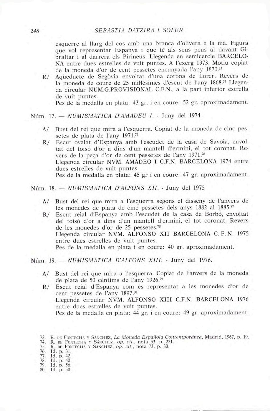 L'autor incideix sobre un terna de trasceridencia indubtable i sobre el qual a part alguns articles periodistics que recolliren el fet «en calent», s'ha estes un estrany silenci. El fet es que ja a l'any 1979 uns coHeccionistes mostraren al director de la Fabrica de Moneda uns exemplars en or de la moneda de pesseta. Aixo Iou a Barcelona, durant el coHoqui que fou organitzat amb motiu de la II Setmana Nurnismatica. L'alt funcionari manifesta la seva mes gran estupefaccio i prornete investigar I'afer. No se'n parla rnes, fins que el diari s, «tres anys rnes ta rd », parlaven d'un obrer que falsificava proves, etc., fet del que es fa resso el nostre amic Valls. Donada la trascendencia de I'afer resulta realmen t sorprenent Ja poca diligencia que les autoritats monetaries posaren en joe, tot permetent que al llarg dels tres anys esmentats apareguessin lesmes curioses fantasies monetaries: monedes actuals batudes sobre peces de Franco 0 be d'Alfons XIII, peces d'una pes seta batudes sobre cospells de duro, 0 viceversa, "proves» en coure deles monedes de niquel, etc. Voldriem creure que l'obrer des cobert fou I'autor d'aquests fets, per be que hom es sent inclinat a malpensar en la classica operaci6 de cercar qualsevol cap de turc.