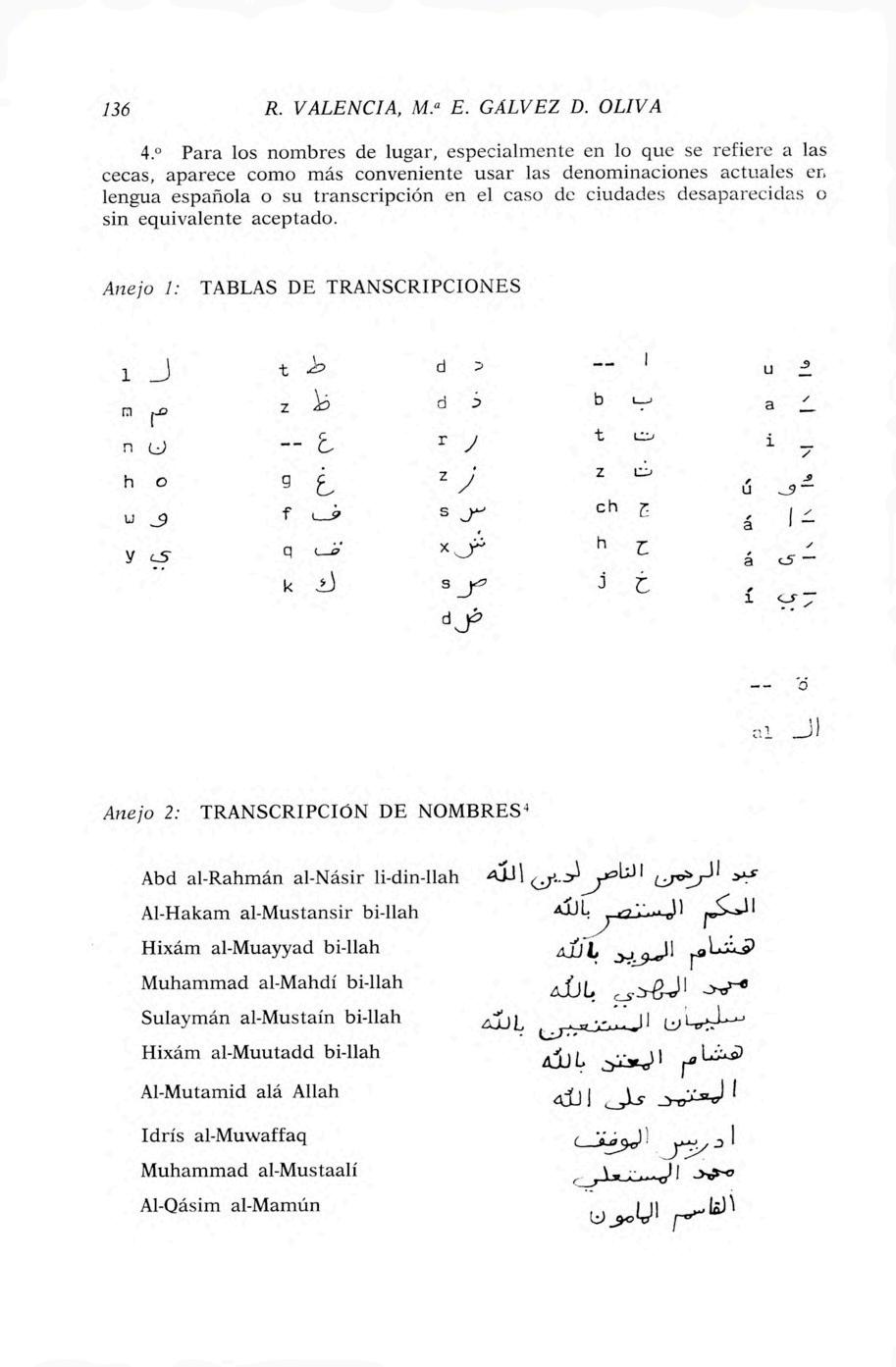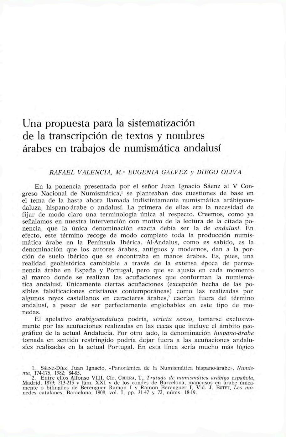 VALENCIA, R., GALVEZ, M.« E., OLIVA, D. Una propuesta para la sistematizacion de la transcripciort de textos y nombres arabes en trabajos de nurnismdtica andalusi 131