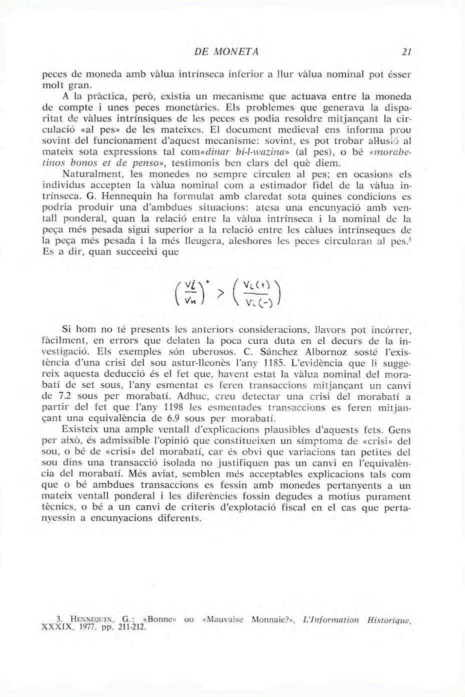 Ante todo, para clarificar las expresiones deberemos separar el argentocomo-peso, que no llega a Leon-Castilla al menos hasta la implantacion del Marco Alfonsi 0 de Colonia y el argento-coma-dinero que nunca ha pesado en aquellos reinos 10 propuesto por Gil Farres. Podria haber pesado 2,72 gramos siguiendo la metrologia arabe (el dirhem) 0 1,36-0,68 gramos si aceptamos la metrologia catalana (el dinero), la cual no hace mas que cefiirse, como la arabe, a la constante europea de la epoca.