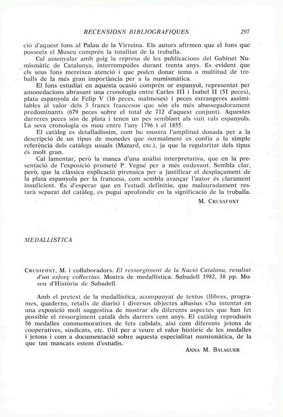 Desitgem per a aquest libre la difusio que es mereix i cal felicitar l'autor per I'enorrne esforc que la seva redacci6 i acurada analisi Ii ha suposat. M. CRUSAFONT