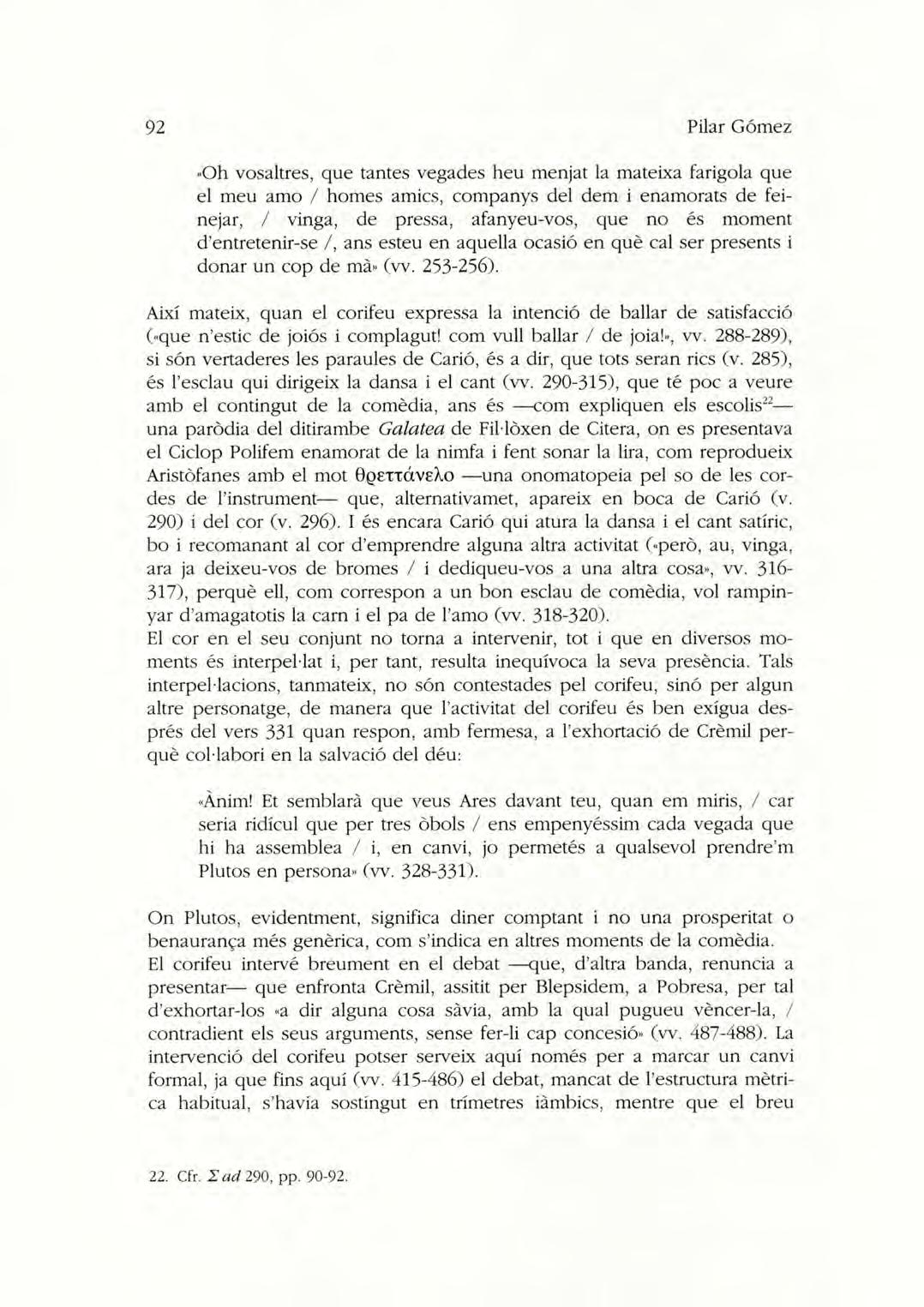 Per acabar ara el nostre recorregut pel Plums d'Arist6fanes i despres de rellegir alguns versos que ens han sernblat mes significatius per al nostre prop6sit -els quals no son, certament, els unics-, potser podriem considerar que el poeta no renuncia definitivarnent a deterrninats ternes i motius, si, pero, que tal vegada prova de presentar-los d'una altra manera. En aquest canvi d'estil -enshem referit en diversos moments al terme TpoJtov-, hi to alguna cosa a veure la transformacio formal de la comedia, condicionada, en bona part, per factors aliens al teatre, pero no va descartat que la reforma coreutica que afecta el Plutos interpretes ja una situacio artistica que donava menys importancia al cor. Aixi mateix, aquesta transformaci6 formal de la comedia, per exemple, tamhe amb una drastica reduccio dels atacs i de les referencies directes de tipus personal -lluny, doncs, de l'ovoµaoTi xw t Ely que vincula aquest genere dramatic a la tradicio iamhica-, facilita el cami cap a un proces d'aplicacio mes generica dels conceptes expressats, cap a una certa ahstraccio: la riquesa es figura mitica, pero tamhe diner comptant i, alhora, un conjunt de hens que defineixen un model de vida. Passar de la censura oherta a l'al-lusio indirecta pot tenir una incidencia de tipus etic i moral: la critica i el blasme no van contra un individu, sing contra el que aquest individu fa o representa. 11-lustra, doncs, un r16og, un caracter i, per tant, aspira, d'alguna manera, a ensenyar, a esdevenir tota ella faula, model exemplar. Tal vegada per aixo, el Plutos, encara que mancat de la forca lirica d'altres comedies aristofaniques, fou 1'obra mes popular del poeta en 1'antiguitat tardana, ,an age which was really repelled and bewildered by the Old Comedy), --escriu Murray- 4ound the Plutus less offensive than any of Aristophanes' earlier plays, less unintelligible, and, in fact, less unlike Menander,`.