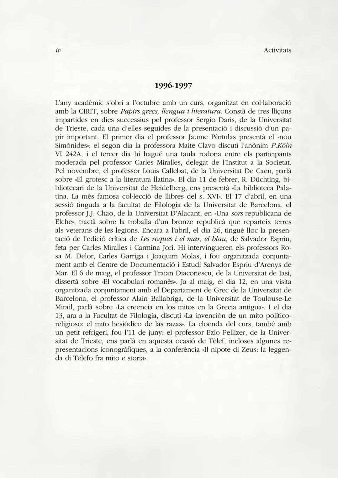 L'any academic s'obri a 1'octubre amh un curs, organitzat en col-laboracio amb la CIRIT, sobre Papirs grecs, llengua i literatura Consta de tres llicons impartides en dies successius pet professor Sergio Daris, de la Universitat de Trieste, cada una d'elles seguides de la presentacio i discussio d'un papir important. El primer dia el professor Jaume Portulas presenta el ,nou Simonides,; el segon dia la professora Maite Clavo discuti 1'an6nim P.Koln VI 242A, i el tercer dia hi hague una taula rodona entre els participants moderada pet professor Carles Miralles, delegat de l'Institut a la Societat. Pel novembre, el professorLouis Callehat, de la Universitat De Caen, parts sobre ^^El grotesc a la literatura llatina,,. El dia 11 de febrer, R. Duchting, hibliotecari de la Universitat de Heidelberg, ens presenta ,La hibliotecaPalatina. La mes famosa col-lecci6 de Ilibres del s. XVI,,. El 17 d'ahril, en una sessi6 tinguda a la facultat de Filologia de la Universitat de Barcelona, el professor J.J. Chao, de la Universitat D'Alacant, en ,Una sors republicana de Elche,,, tracts sobre la troballa d'un bronze republics que reparteix terres als veterans de les legions. Encara a l'ahril, el dia 26, tingue floc la presentaci6 de 1'edici6 critica de Les roques i el mar, el Blau, de Salvador Espriu, feta per Cartes Miralles i Carmina Jori. Hi intervingueren els professors Rosa M. Delor, Caries Garriga i Joaquim Molas, i fou organitzada conjuntament amb el Centre de Documentacio i Estudi Salvador Espriu d'Arenys de Mar. El 6 de maig, el professor Traian Diaconescu, de la Universitat de Iasi, disserta sobre ,El vocabulari romanes,,. Ja al maig, el dia 12, en una visita organitzada conjuntament amb el Departament de Grec de la Universitat de Barcelona, el professor Alain Ballabriga, de la Universitat de Toulouse-Le Mirail, parla sobre ,La creencia en los mitos en la Grecia antigua,^. I el dia 13, ara a la Facultat de Filologia, discuti ,La invenci6n de un mito politicoreligioso: el mito hesi6dico de las razas^. La cloenda del curs, tambe amh un petit refrigeri, fou I'll de juny: el professor Ezio Pellizer, de la Universitat de Trieste, ens parla en aquesta ocasi6 de Telef, incloses algunes representacions iconografiqLies, a la conferencia «Il nipote di Zeus: la leggenda di Telefo fra mito e storia,,.