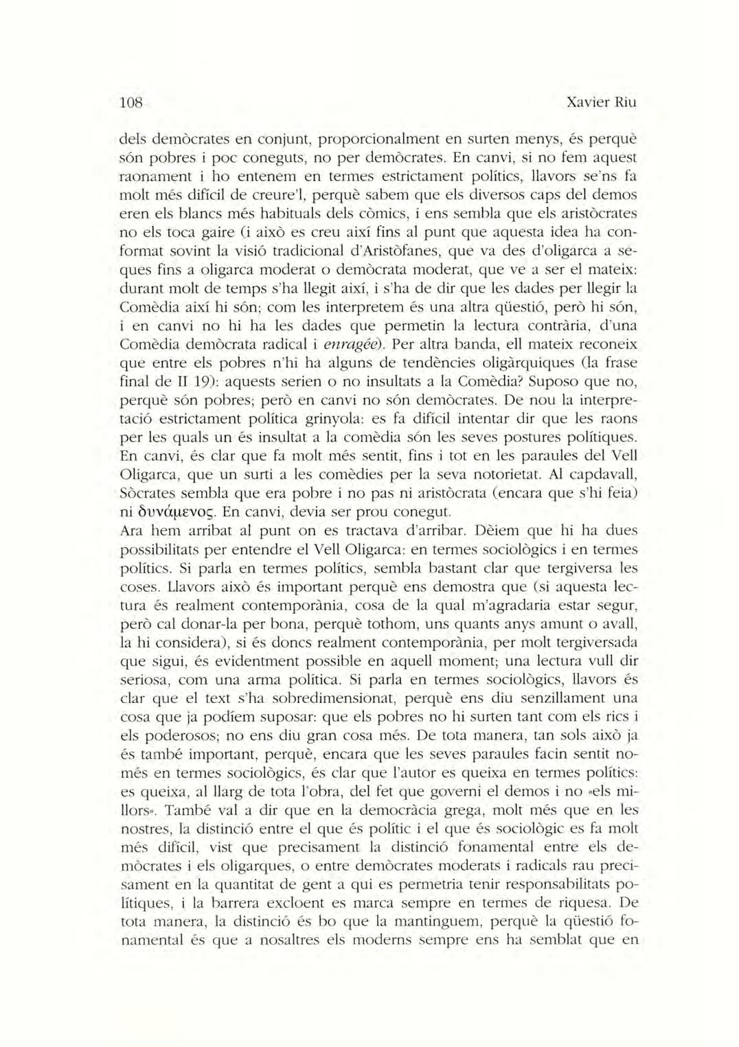 dels democrates en conjunt, proporcionalment en surten menys, es perque son pobres i poc coneguts, no per democrates. En canvi, si no fern aquest raonament i ho entenem en termes estrictament politics, llavors se'ns fa molt mes dificil de creure'l, perque sabem que els diversos caps del demos eren els Blanes mes habituals dels comics, i ens sembla que els aristocrates no els toca gaire (i aixo es crew aixi fins al punt que aquesta idea ha conformat sovint la visio tradicional d'Aristofanes, que va des d'oligarca a seques fins a oligarca moderat o democrata moderat, que ve aser el mateix: durant molt de temps s'ha llegit aixi, i s'ha de dir que les Jades per llegir la Comedia aixi hi son; com les interpretem es una altra giiestio, pero hi son, i en canvi no hi ha les Jades que permetin la lectura contraria, d'una Comedia democrata radical i enragee). Per altra banda, ell mateix reconeix que entre els pobres n'hi ha alguns de tendencies oligarquiques (la frase final de II 19): aquests serien o no insultats a la Comedia? Suposo que no, perque son pobres; pero en canvi no son democrates. De nou la interpretacio estrictament politica grinyola:es fa dificil intentar dir que les raons per les quals un es insultat a la comedia son les seves postures politiques. En canvi,es clar que fa molt mes sentit, fins i tot en les paraules del Vell Oligarca, que un surti a les comedies per la seva notorietat. Al capdavall, Socrates sembla que era pobre i no pas ni aristocrata (encara que s'hi feia) ni buvaµsvog. En canvi, devia ser prow conegut. Ara hem arribat al punt on es tractava d'arribar. Deiem que hi ha dues possibilitats per entendre el Vell Oligarca: en termes sociologics i en termes politics. Si parla en termes politics, sembla bastant clar que tergiversa les coses. Llavors aixo es important perque ens demostra que (si aquesta 1ectura es realment contemporania, cosa de la qual m'agradaria estar segur, pero cal donar-la per bona, perque tothom, uns quantsanys amunt o avall, la hi considera), si es doncs realment contemporania, per molt tergiversada que sigui, es evidentment possible en aquell moment; una lectura vull dir seriosa, com una arena politica. Si parla en termes sociologics, llavors es clar que el text s'ha sobredimensionat, perque ens diu senzillament una cosa que ja podiem suposar: que els pobres no hi surten tant com els rics i els poderosos; no ens diu gran cosa mes. De tota manera, tan sols aixo ja es tambe important, perque,encara que les seves paraules facin sentit nomes en termes sociologics, es clar que l'autor es queixa en termes politics: es queixa, al llarg de tota l'obra, del fet que governi el demos i no ,els millors,,. Tambe val a dir que en la democracia grega, molt mes que en les nostres, la distincio entre el que es politic i el que es sociologic es fa molt mes dificil, vist que precisament la distincio fonamental entre els democrates i els oligarques, o entre democratesmoderats i radicals rau precisament en la quantitat de gent a qui es permetria tenir responsabilitats politiques, i la barrera excloent es marca sempre en termes de riquesa. De tota manera, la distincio es ho que la mantinguem, perque la questio fonamental es clue a nosaltres els moderns sempre ens hasemblat que en
