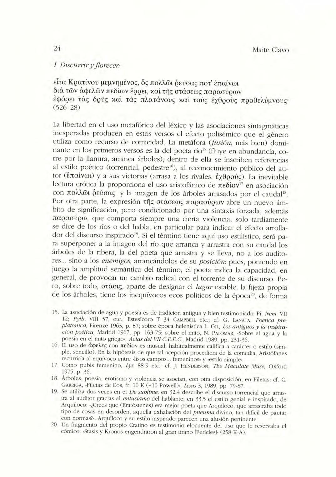 La libertad en el use metaforico del lexico y las asociaciones sintagmaticas inesperadas producen en estos versos el efecto polisemico que el genero utiliza corno recurso de comicidad. La metafora (fusi(jn, mas bien) dominante en los primeros versos es la del poeta rio15 (fluye en abundancia, corre por la Ilanura, arranca arboles); dentro de ella se inscriben referencias a] estilo poetico (torrencial, pedestre"), al reconocimiento publico del autor (eatalvwt) y a sus victorias (arrasa alos rivales, >xOpovs). La inevitable lectura erotica la proporciona el use aristofanico de atcbLov" en asociacion con jroXX6 i &VOas y la imagen de los arboles arrasados por el caudal'". Por otra parte, la expresion TTIS GTaOEWS ataQaonQwv abre un nuevo ambito de significacion, pero condicionado por una sintaxis forzada; ademas 7tapaowQw, que comporta siempre una cierta violencia, solo tardiamente se dice de los rios o del habla, en particular para indicar el efecto arrollador del discurso inspirado". Si el termino tiene aqui use estilistico, sera Para superponer a la imagen del rio que arranca y arrastra con su caudal los arboles de la ribera, la del poeta que arrastra y se Ileva, no a los auclitores... sino alos enemigos, arrancandolos de su posicidn: pues, poniendo en juego la amplitud semantica del termino, el poeta indica la capacidad, en general, de provocar un cambio radical con el torrente de su discurso. Pero, sobre todo, otaots, aparte de designar el Lugar estable, la fijeza propia de los arboles, tiene los inequivocos ecos politicos de la epoca20, deforma