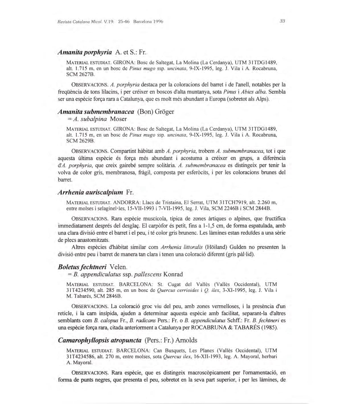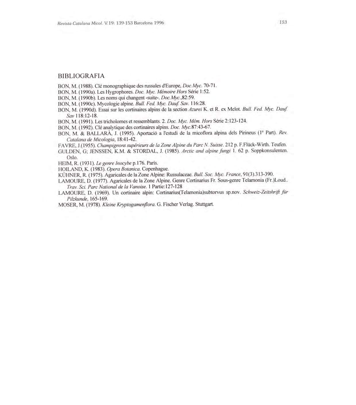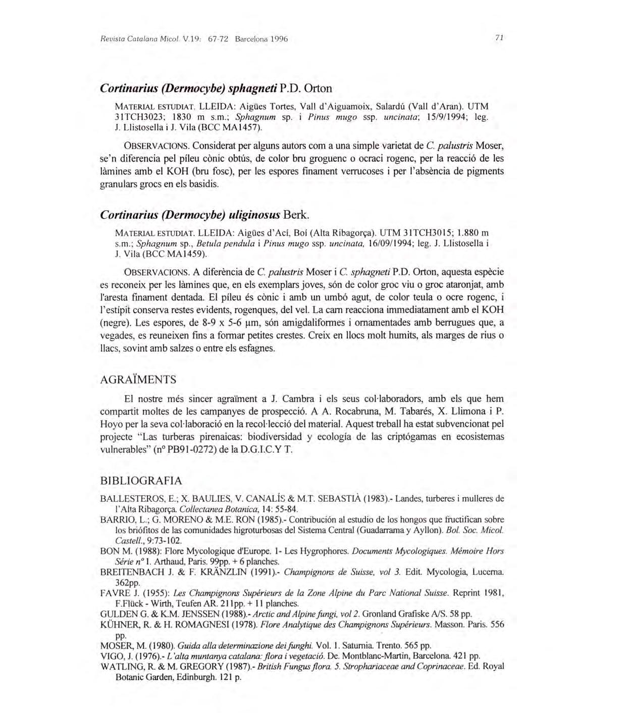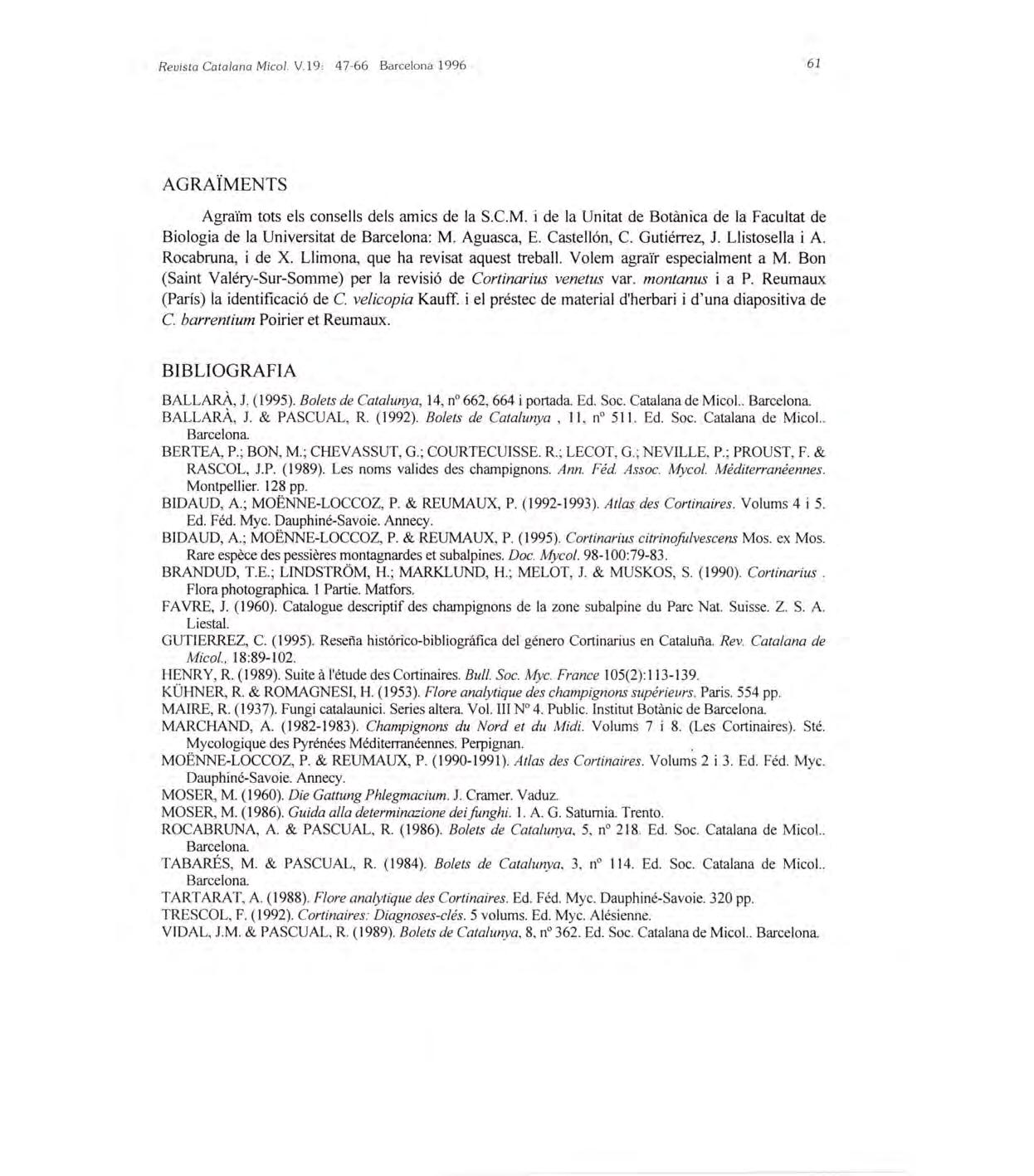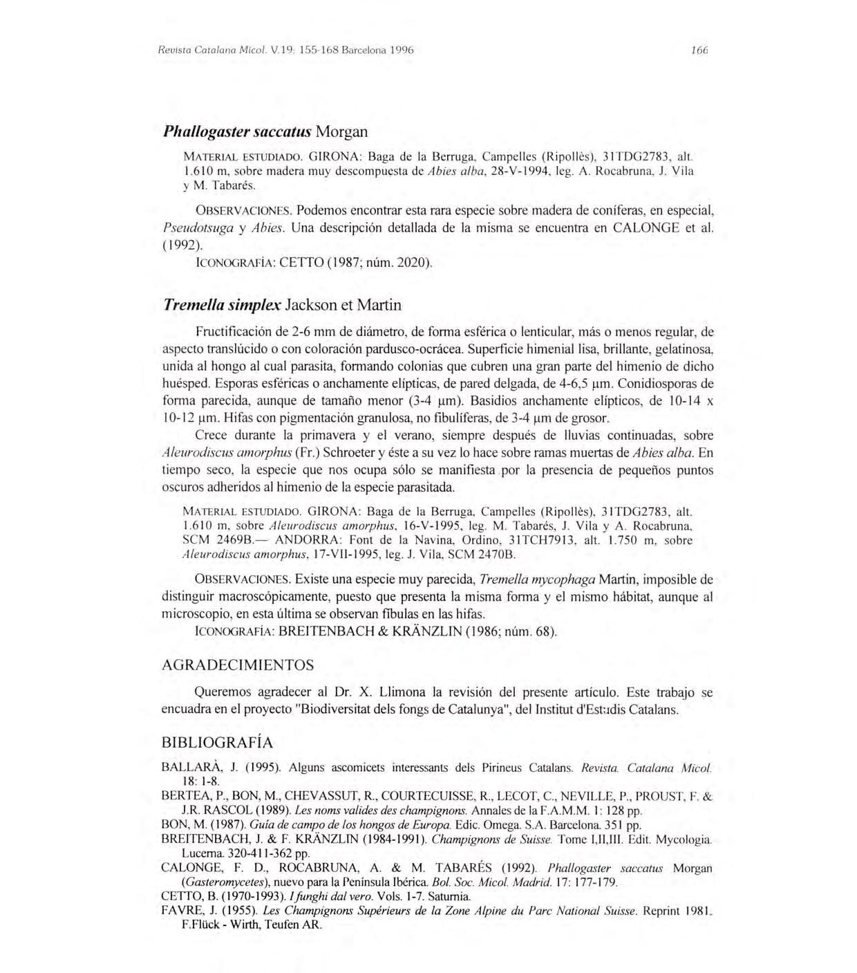 VolemagrairaF.Pando(RealJardínBotanico , C .S.LC.) laseva col-Iaboraci ó en permetre'ns la consulta delesbasesdedadesde"Flora Micológica Ibérica". Aquest treballhaestatenpart finançatpelprojecte"Flora Micológica Ibérica, 11" dela DGICYT n° PB-92-0012, onhihaintegrat undenosaltres(S.S.).
