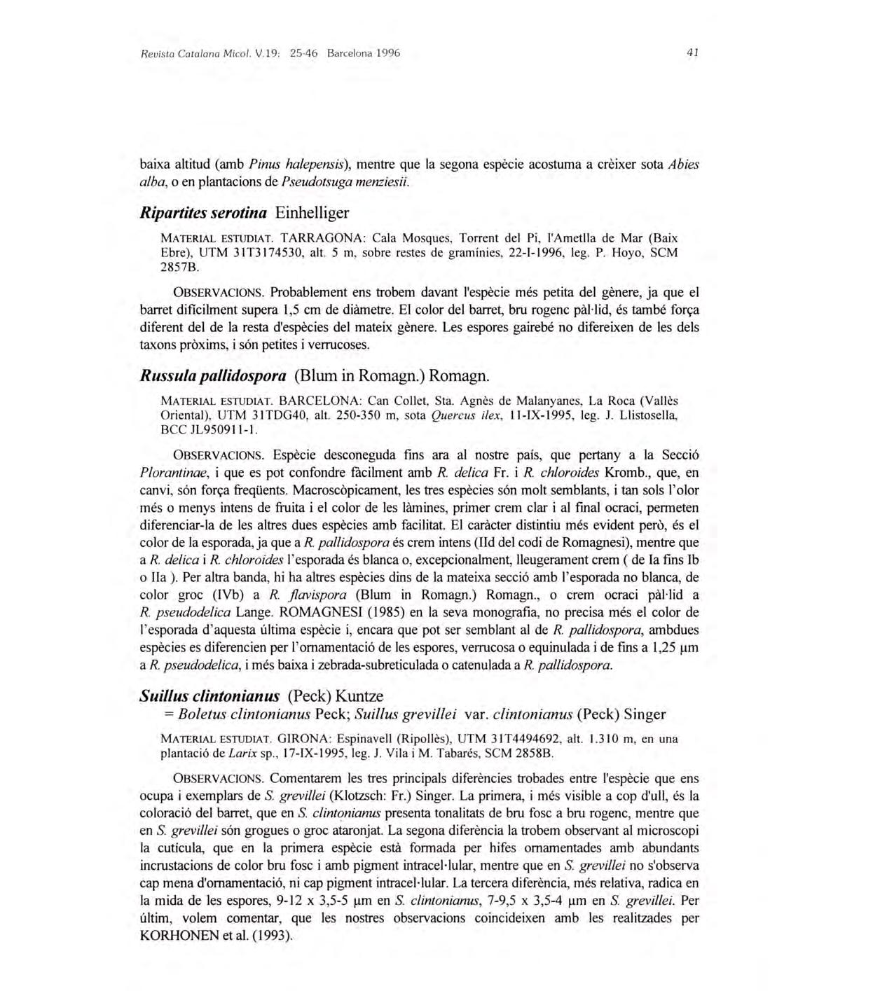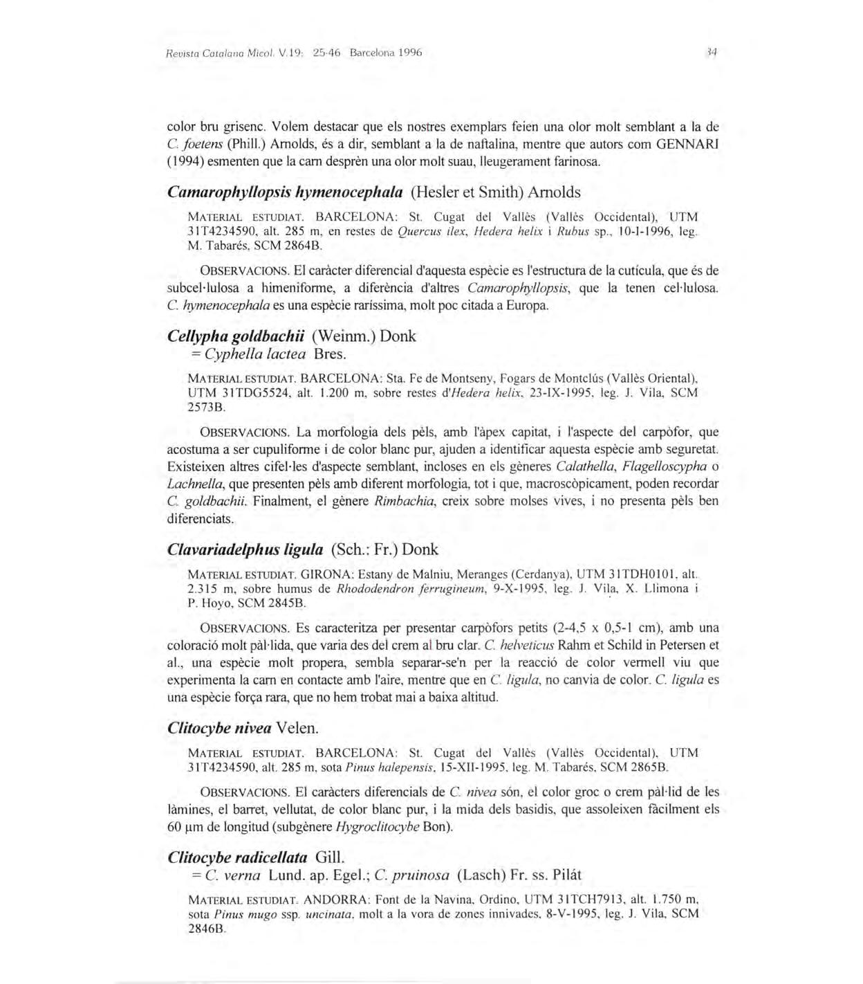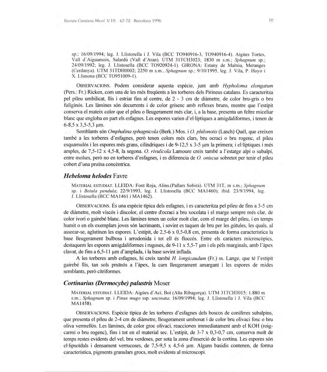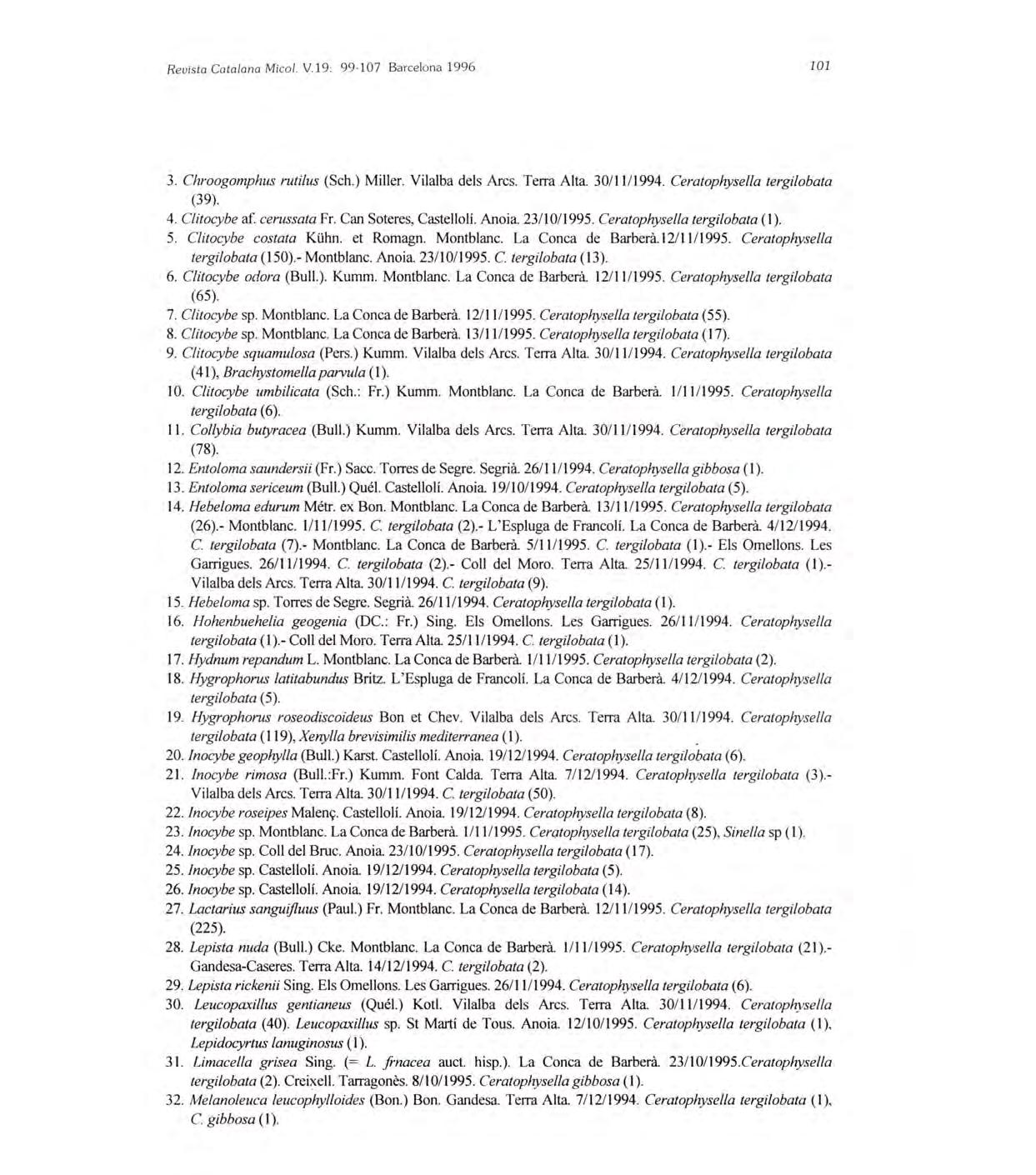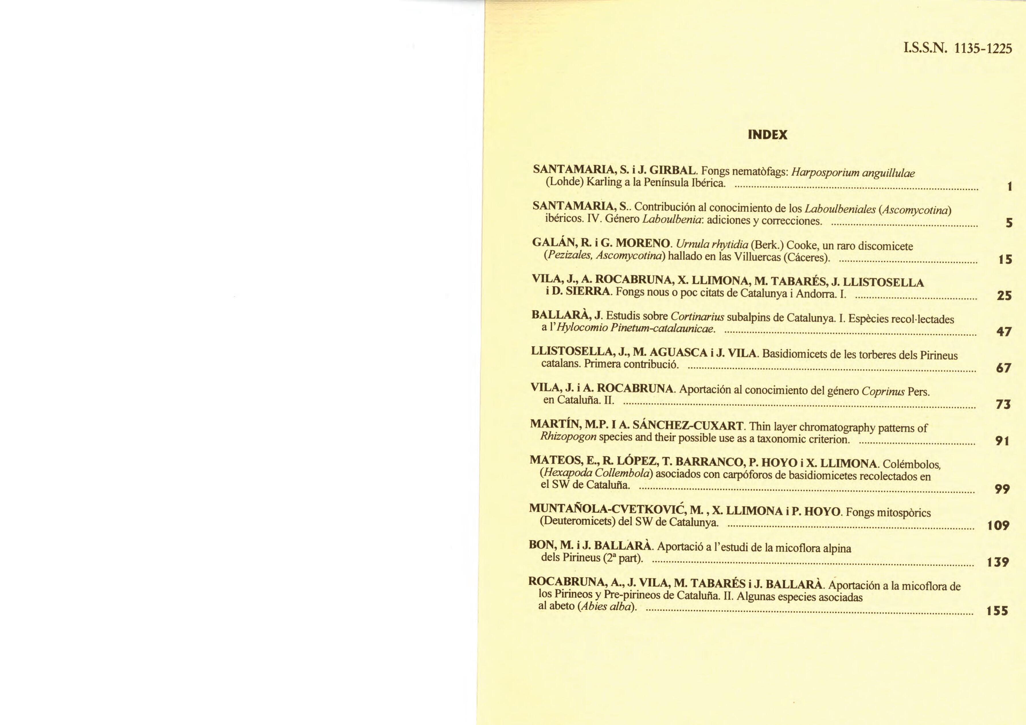 VolemagrairaF.Pando(RealJardínBotanico , C .S.LC.) laseva col-Iaboraci ó en permetre'ns la consulta delesbasesdedadesde"Flora Micológica Ibérica". Aquest treballhaestatenpart finançatpelprojecte"Flora Micológica Ibérica, 11" dela DGICYT n° PB-92-0012, onhihaintegrat undenosaltres(S.S.).