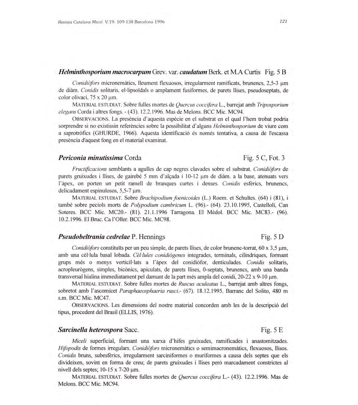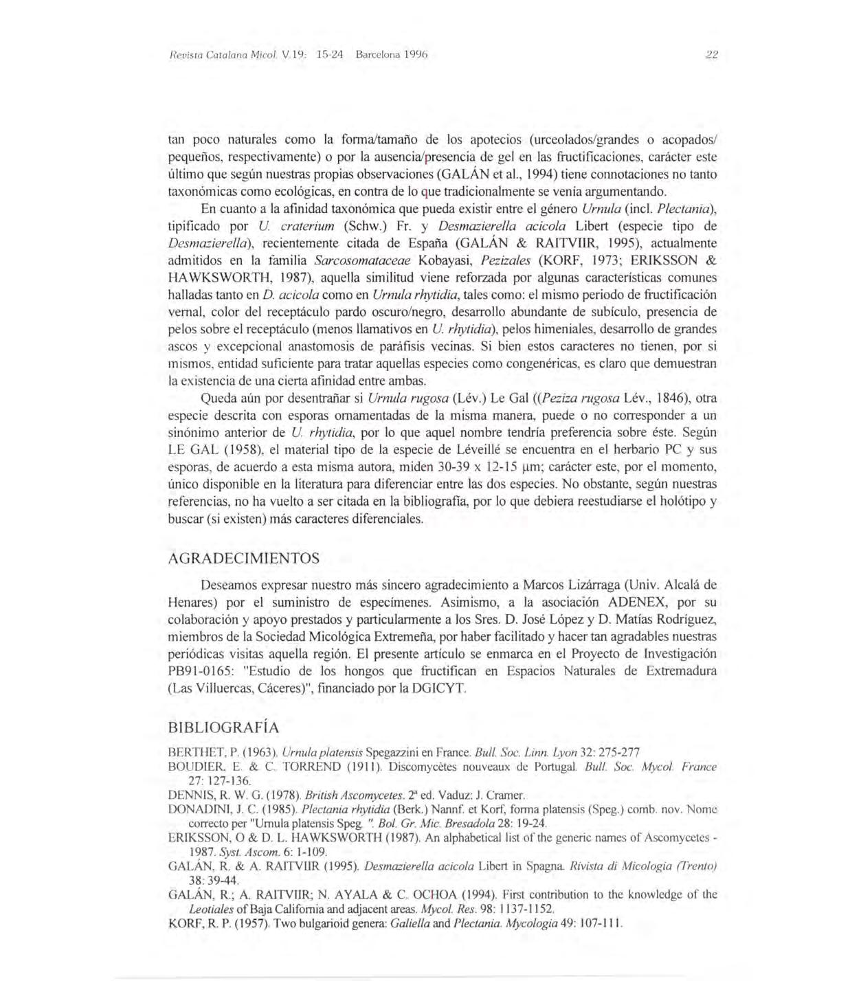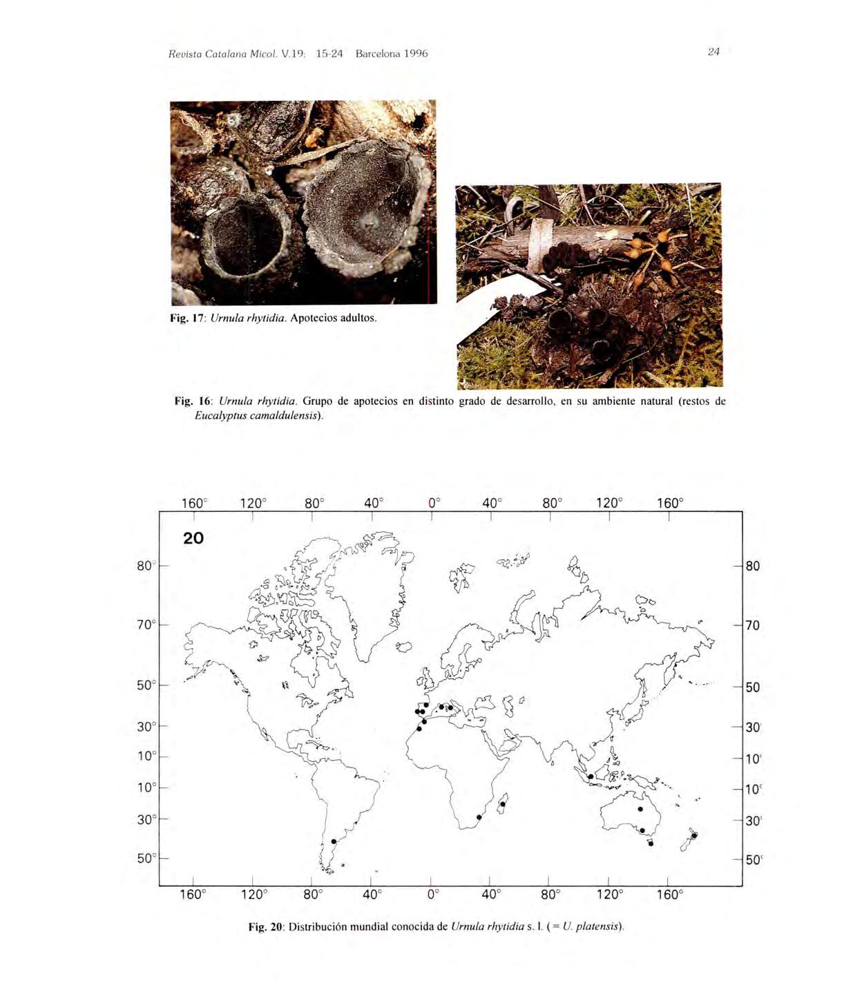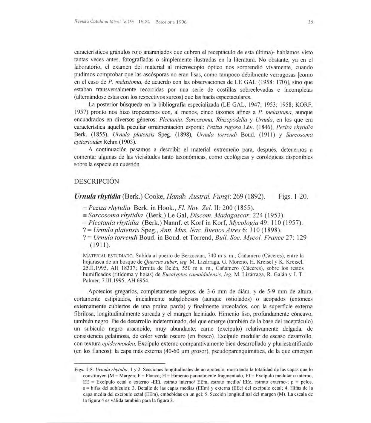 Enestaoportunidad,queremosresaltarlapresenciadeunespectacularascom icete, halladoen dosocasionesdurantemarzode1995,creciendosobrerestosdealcornoquelaprime ra vezysobre restosdeeucalipto,lasegunda.Lasfructificaciones(figs.16-17),deapenasmediocentímetro de diàmetro,deurceoladasainfundibuliformes,poseedorasdeunasuperficieexteriorcompletamente negrayacanalada,noshicieronasimilarlaespecie,enelpropioterreno,acualquieradelos géneros Urnula/Plectania, cuyosmiembros-particularmente Plectania melastoma (aunque,esta vez,sinlos
