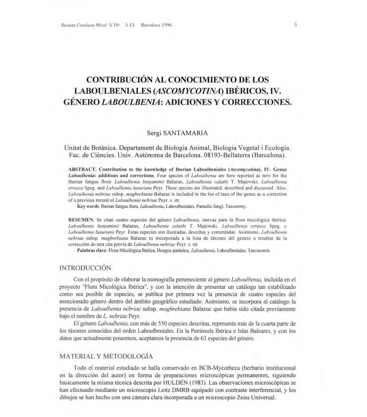 Conel propósito deelaborarlamonografiapertenecientealgénero Laboulbenia, incluidaenel proyecto"FloraMicológicaIbérica",yconlaintencióndepresentarun catalogo tan estabilizado comoseaposibledeespecies,sepublicaporprimeravezlapresenciadecuatroespeciesdel mencionado génerodentrodelàmbitogeogràficoestudiado.Asimismo,seincorporaal catalogo la presenciade Laboulbenia nebriae subsp. maghrebiana Balazucquehabíasidocitada previamente bajoelnombrede L. nebriae Peyre