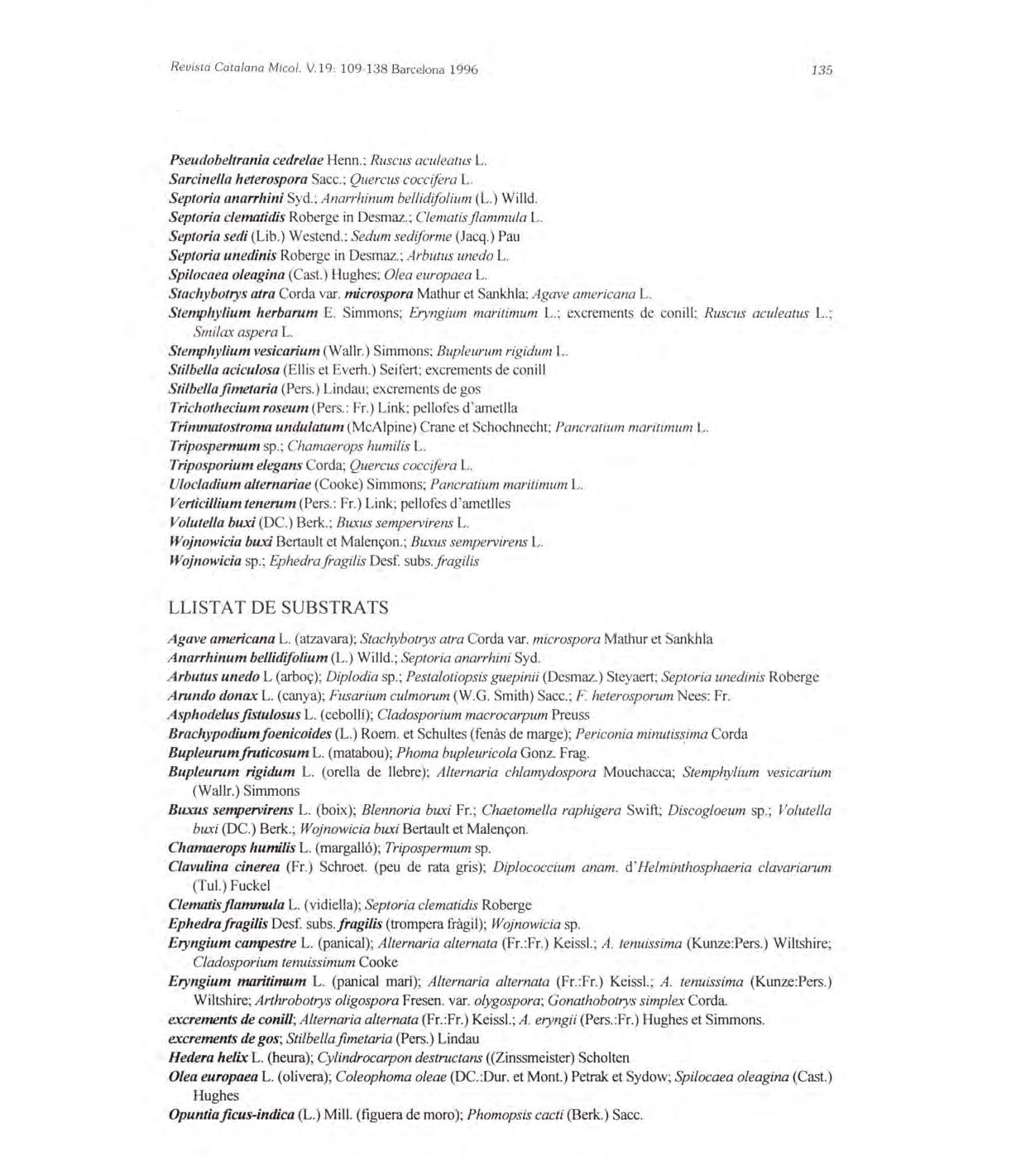 Sedum sediforme (Jacq.)Pau(crespinell gros); Septo ria sedi (L ib.) We stend. Smilax aspera L.(arítjol) ; C ercospora smilacis Thürn. ; Phoma exigua Oesm