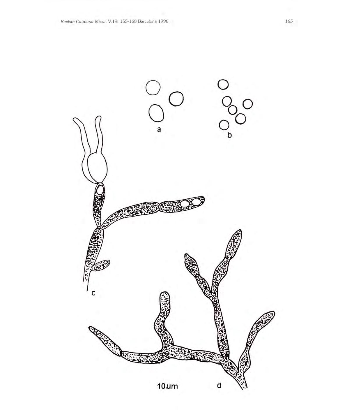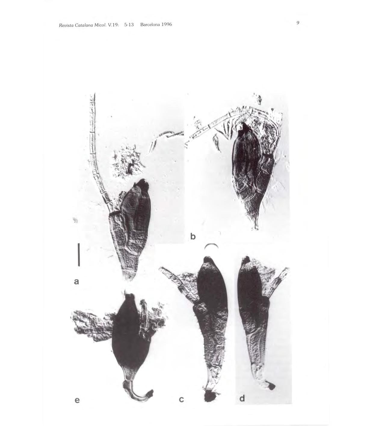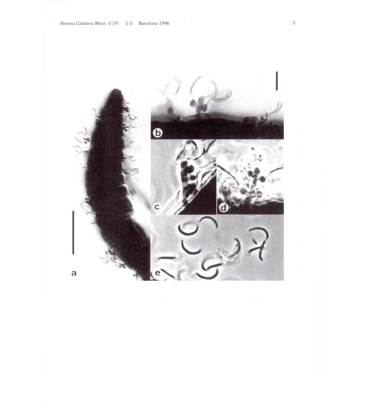 Fig.1a-e. Harposporium anguillulae, aïllatdefems d'ovella recoll its a Bellaterra (Barcelona). a. Aspecte general , sobreelcosdel nemàtode. b-d. Aspecte dels conidiòfors, cèl-lules conidiògenes i conidis. e. Conidis [Escala figuraa:50 um Escala figurab:10 urn, ésla mateixa delesfiguresc-e .] [a-b , contrast interferencial ; c-e, contrast defases Mostres tenyides ambblauco tó].