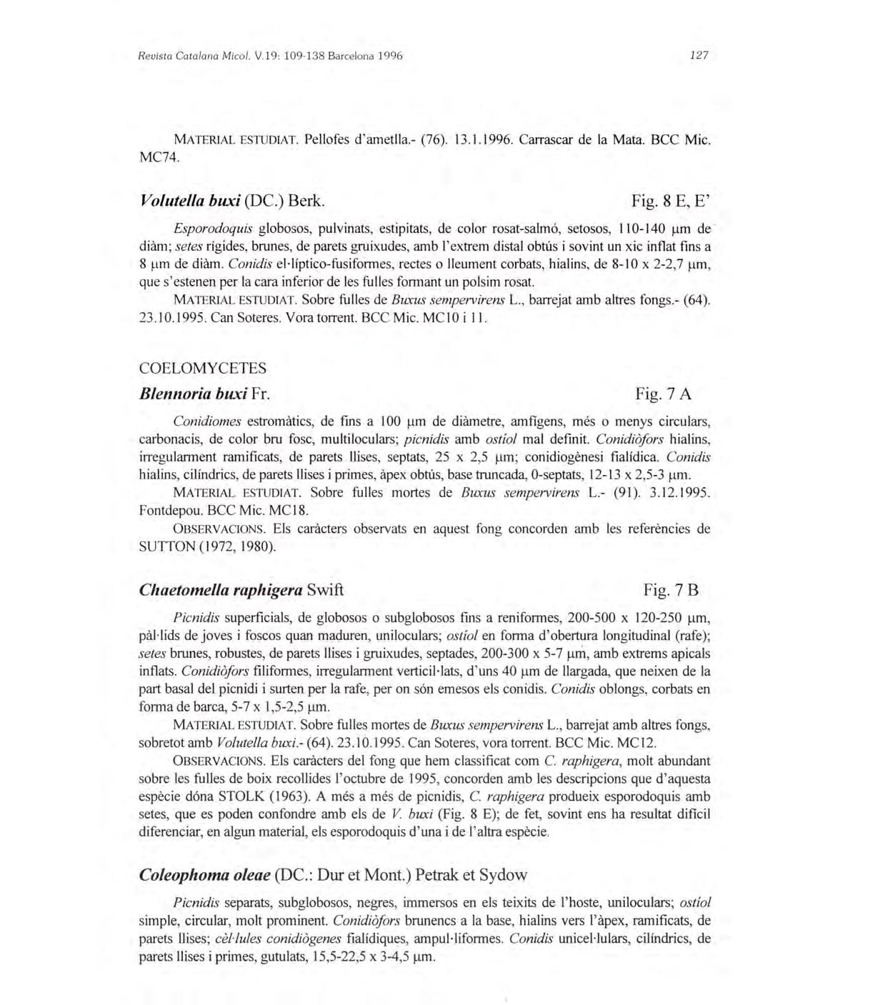 Buxus sempervirens L. (boix); Blennoria buxi Fr.; Chaetomella raphigera Swift; Discogloeum sp.; Volutella buxi (DC.) Berk.; Wojnowicia buxi Bertault et Malençon.