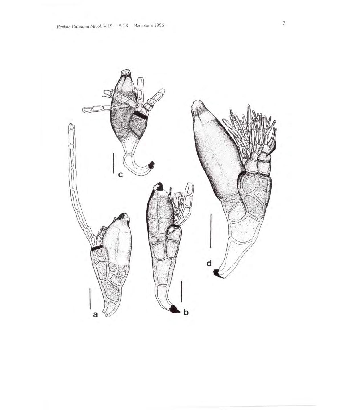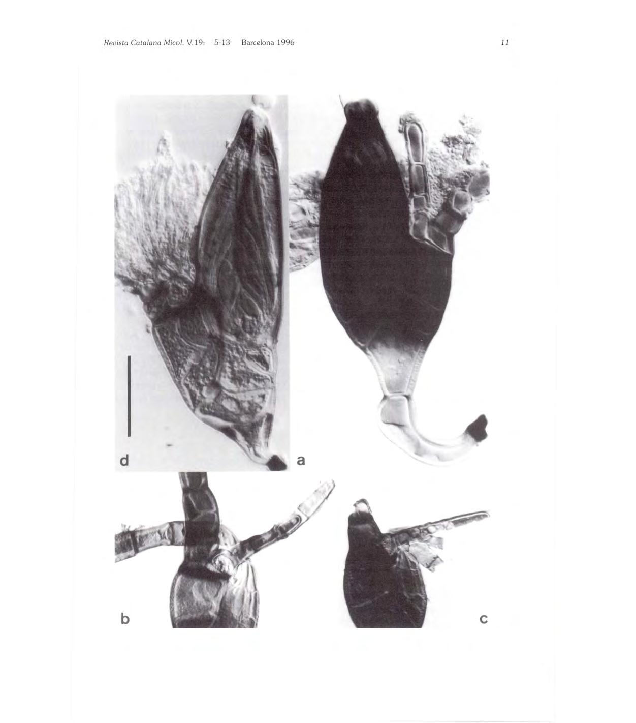 Fig.3. a-c. Laboulbenia etrusca sobre Ocydromus sp.,Pleta d e Mulleres, Vielha e Mijaran (L)(a : SCS-SS·1808a. be: SCS-SS·1808b). b-c.Detalledelabasedelos apéndic es. d. Laboulbenia luxurians sob re Notaphus sp Chiprana (Z) (SCS-SS·1513). [Esca la: 50 um, paratodaslasfiguràs].
