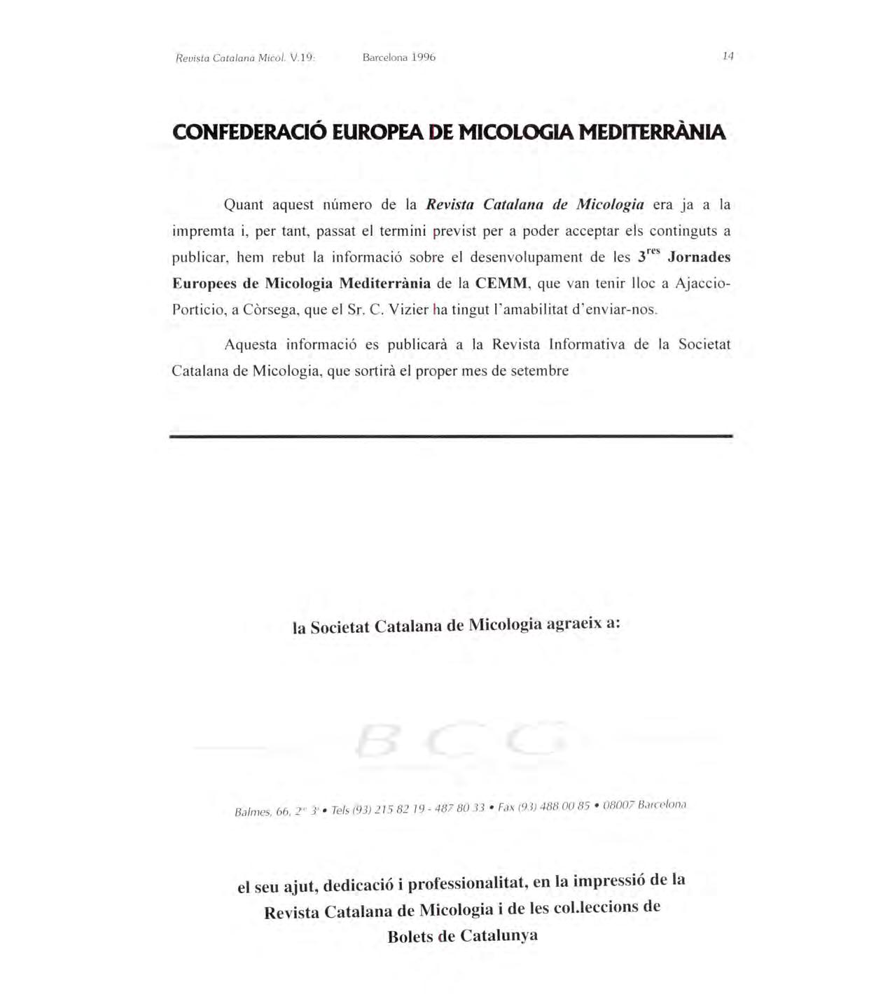 Quant aquest número dela Revis ta Catalanade Micologia era Jaala impremta i, per tant , passat el termini p revist per a poder acceptar els continguts a publicar, hem rebut la informació sob re el desenvo lupament deles3 res Jornades Europees de Micologia Mediterrània dela CEMM , que van tenir lloca AjaccioPorticio , a Còrsega , que elSr.C. Vizier h a tingut l 'amabilitat d 'enviar-nos .