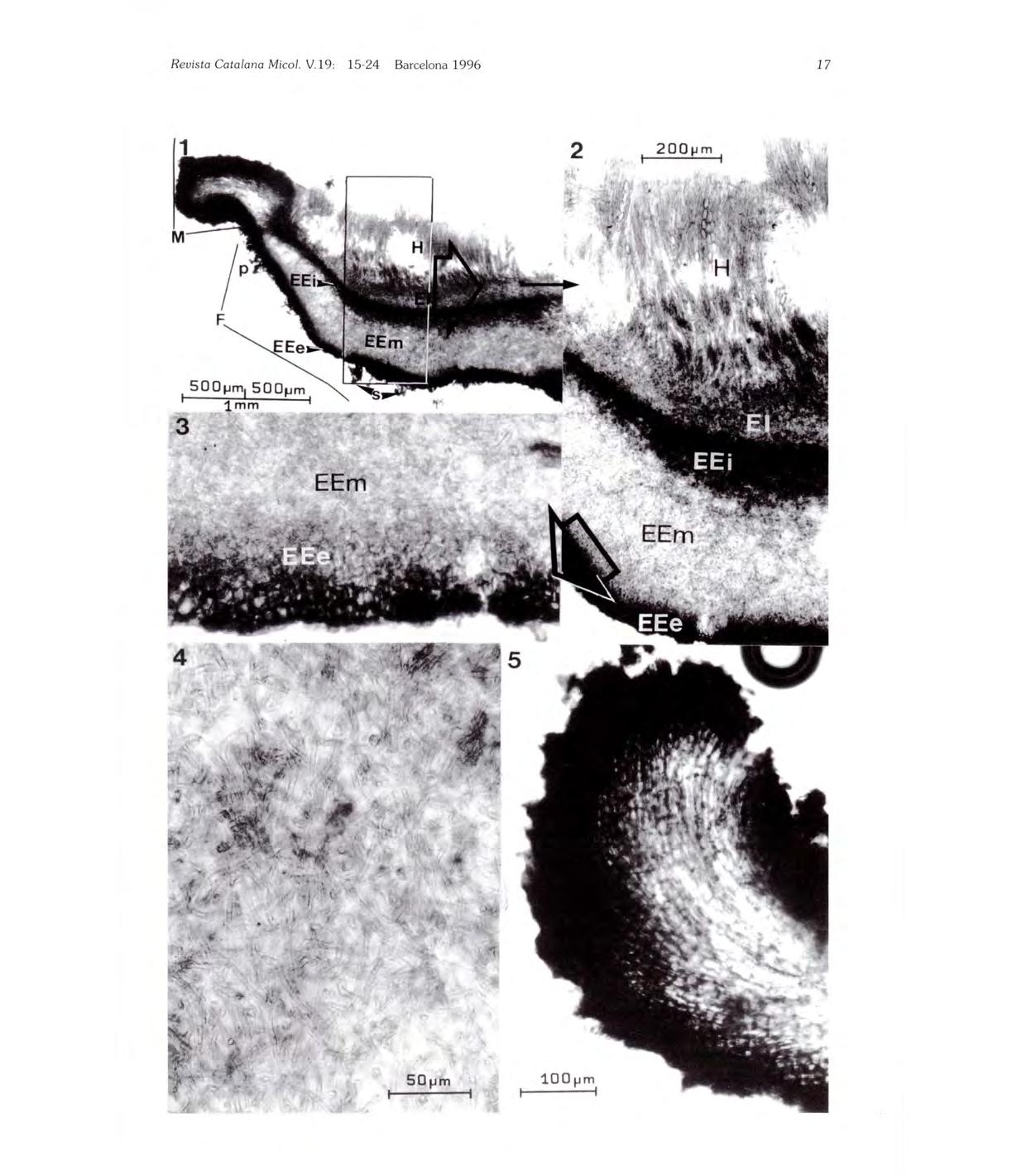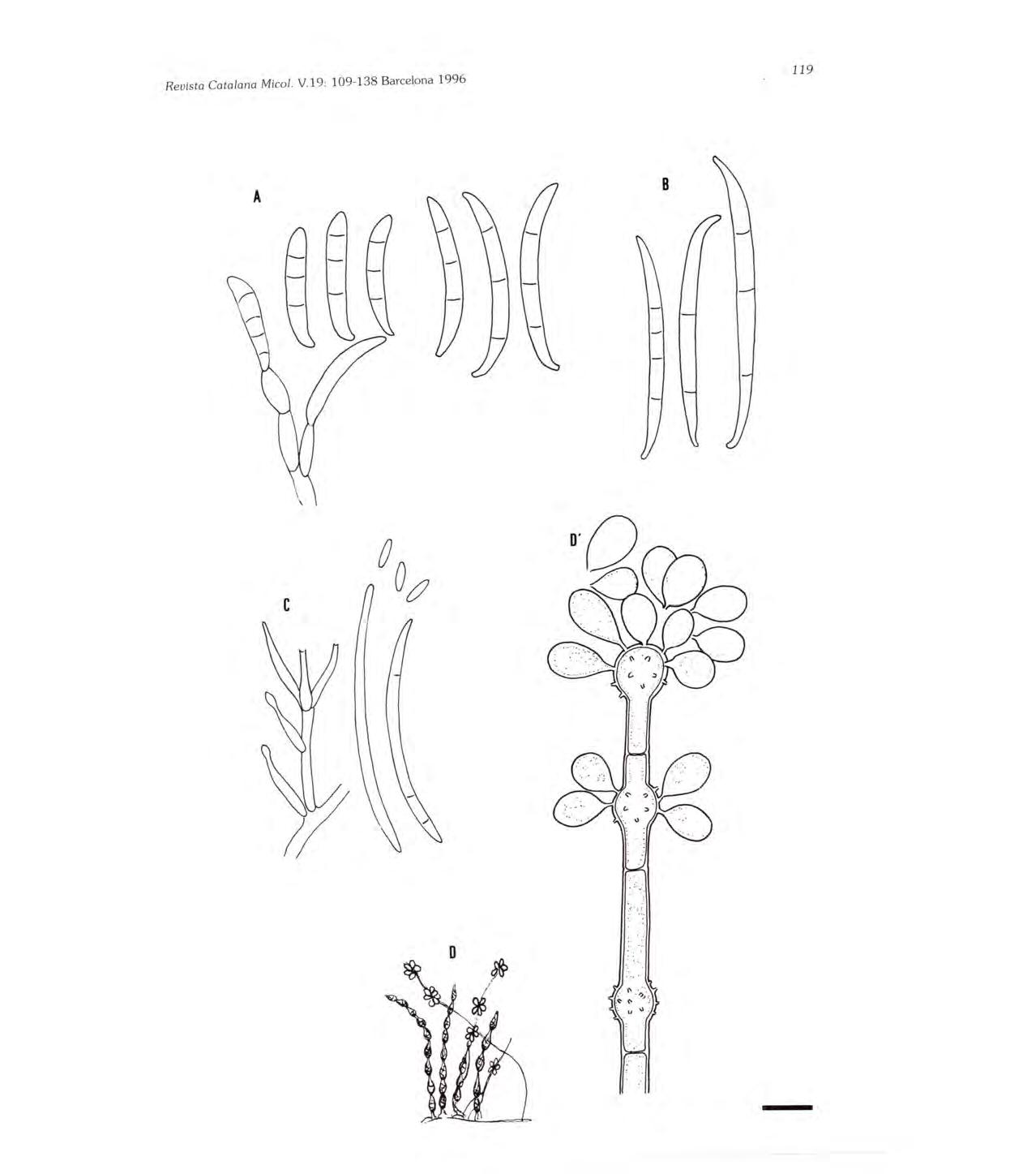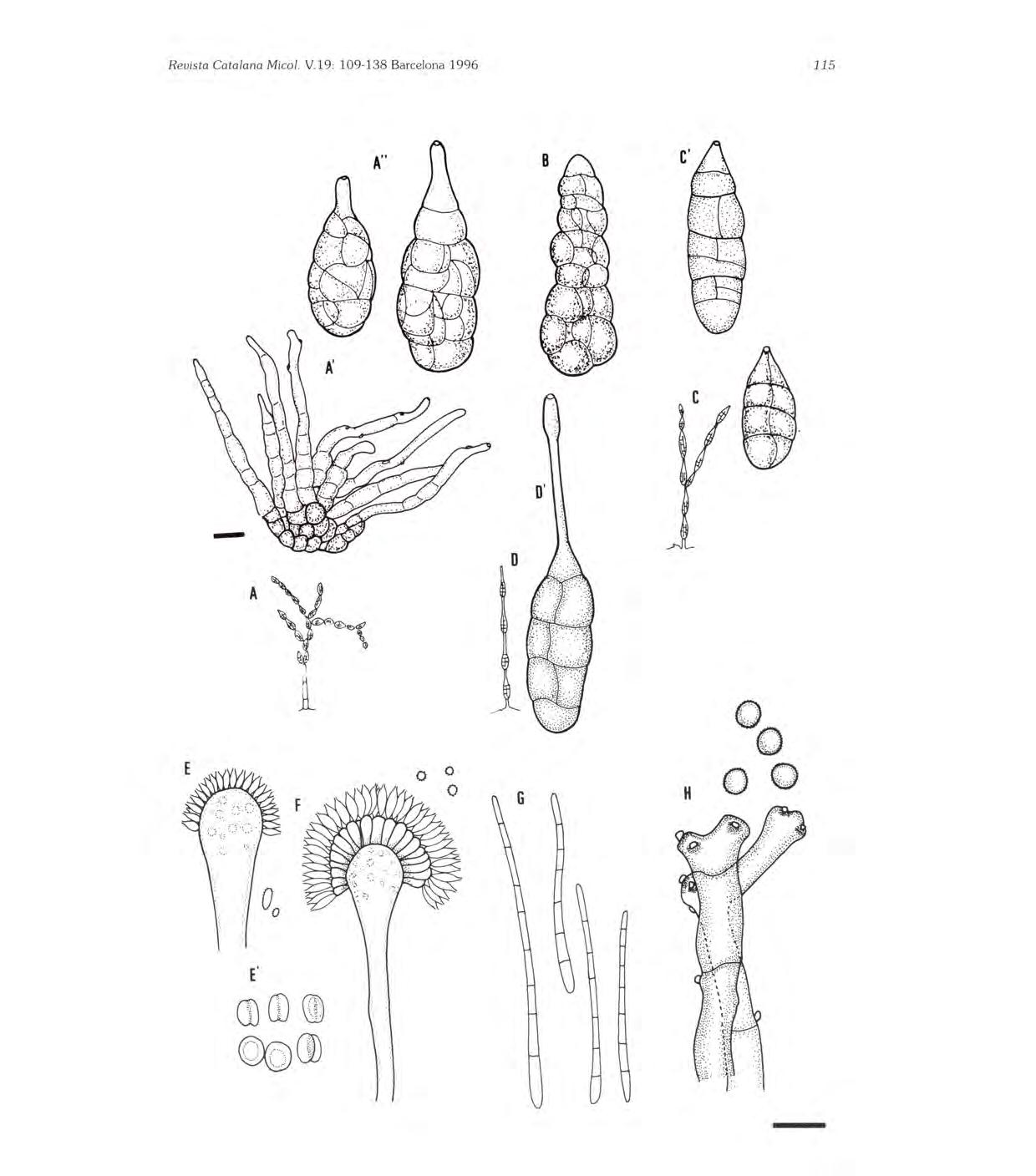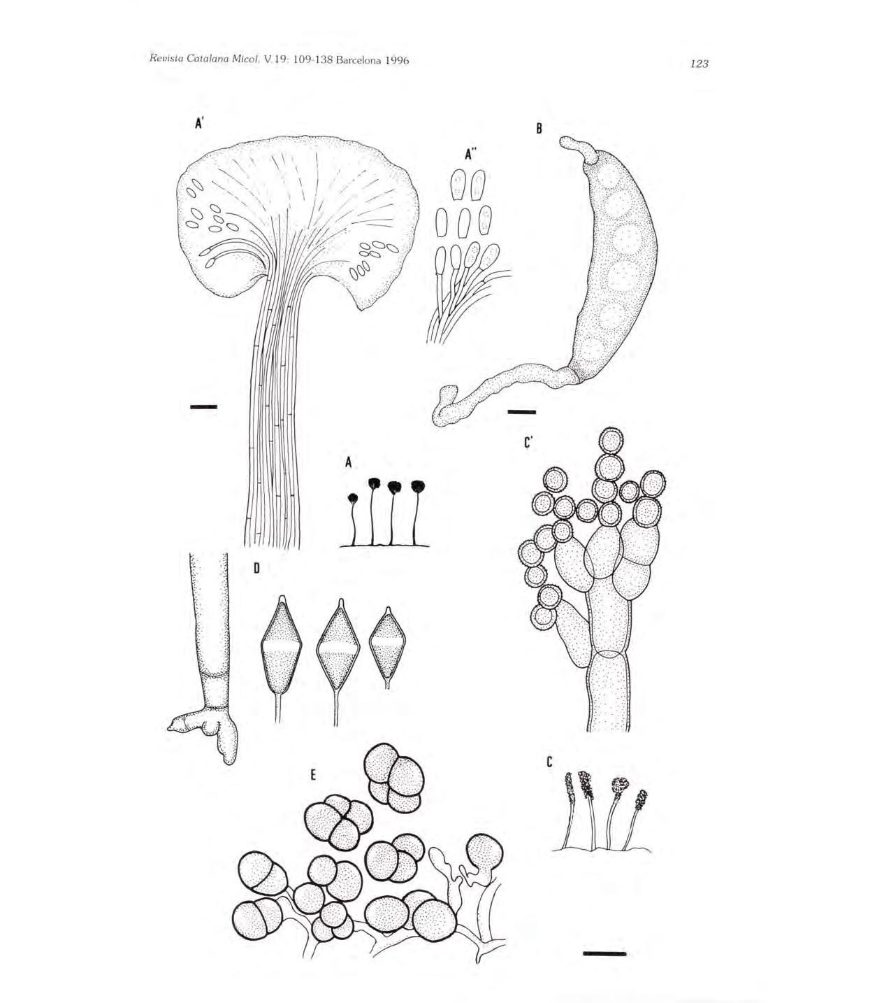 T alo castaño ol ivàceo ob scuro,2 45-288 11m d elongitu d d esde lauñaal apice delperi tecio. Células d el r eceptàculo,V I, V II y ba sales delper iteciopunt eadas. Células Iy 11 hialinas; se pto entre a mbas fuertemen tec onstricto. Cé lulas II I y IV a planadas , mas anchas quelargas.Cél ula V cuneiforme, d ispuestae n el àngulo súpero-interno d ela célula IV,alacual supera ligeramente en longitud. Cél ula d e inse rción a dherida c ercade la b asedelm argen posterior dela pared del peritecio. Apé ndice ex terno sim ple, cl arament e divergente respecto aleje longitudinal del peritecio , obscu ro, c on lacélu la su prabasald oliforme,conlos septos distalybasal obscuros y constrictos. Apéndice interno forma dop or d iversas ramas simples o divididas unavez, situadas directamente sobrela cé lula basal,dosotres d e ell as orientadas hacia el peritecio, alcua1 superan, y formando unàngulo de90°res pecto aleje longitudinal deltalo; célula basal similar ala externa en forma y dimensiones. Peritecio (115-144 x 49-70 11m) obscuro, conlas células parietales orientadas helicoidalmente. Apice simétrico o ligeramente asimétrico, truncado, conloslabios anteriores y posteriores equivalentes, muy prominentes y redondeados. Célula VI mas ancha que larga Ascósporas de63 11m de longitud.