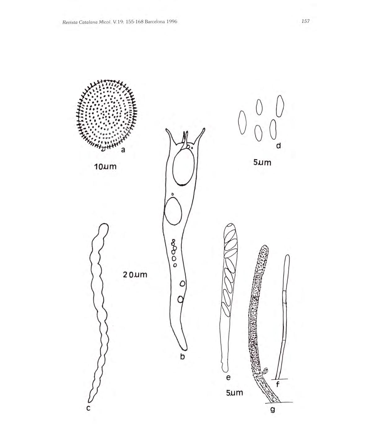 1 - a -e: Aleurodiscus amorph us (F r.) Sc hroe t.;a) e s pora : b)basidio ; e)cistidio - d-g: Lachn ellula subtili ssima (Ckc.)De rmis: d) esporas; e) a sco ; f) pelo:g) paràfisis.